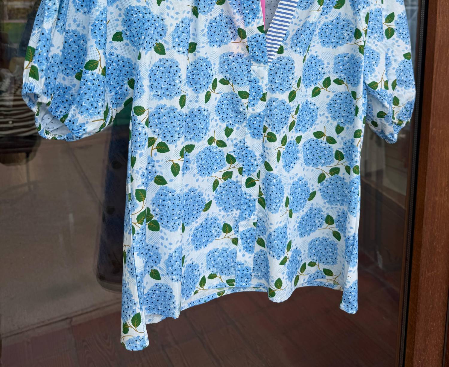This classic, short sleeve tee will be your go-to staple this season and beyond. Introducing the Puff Sleeve Hydrangea Top by THML, a perfect addition to your summer wardrobe in a refreshing blue. This patterned cotton top features short sleeves and a flattering V-neckline. Crafted from 100% cotton, it offers a boho-chic vibe with a convenient pull-on closure. Care instructions require gentle cool hand washing and line drying to maintain its pristine condition.