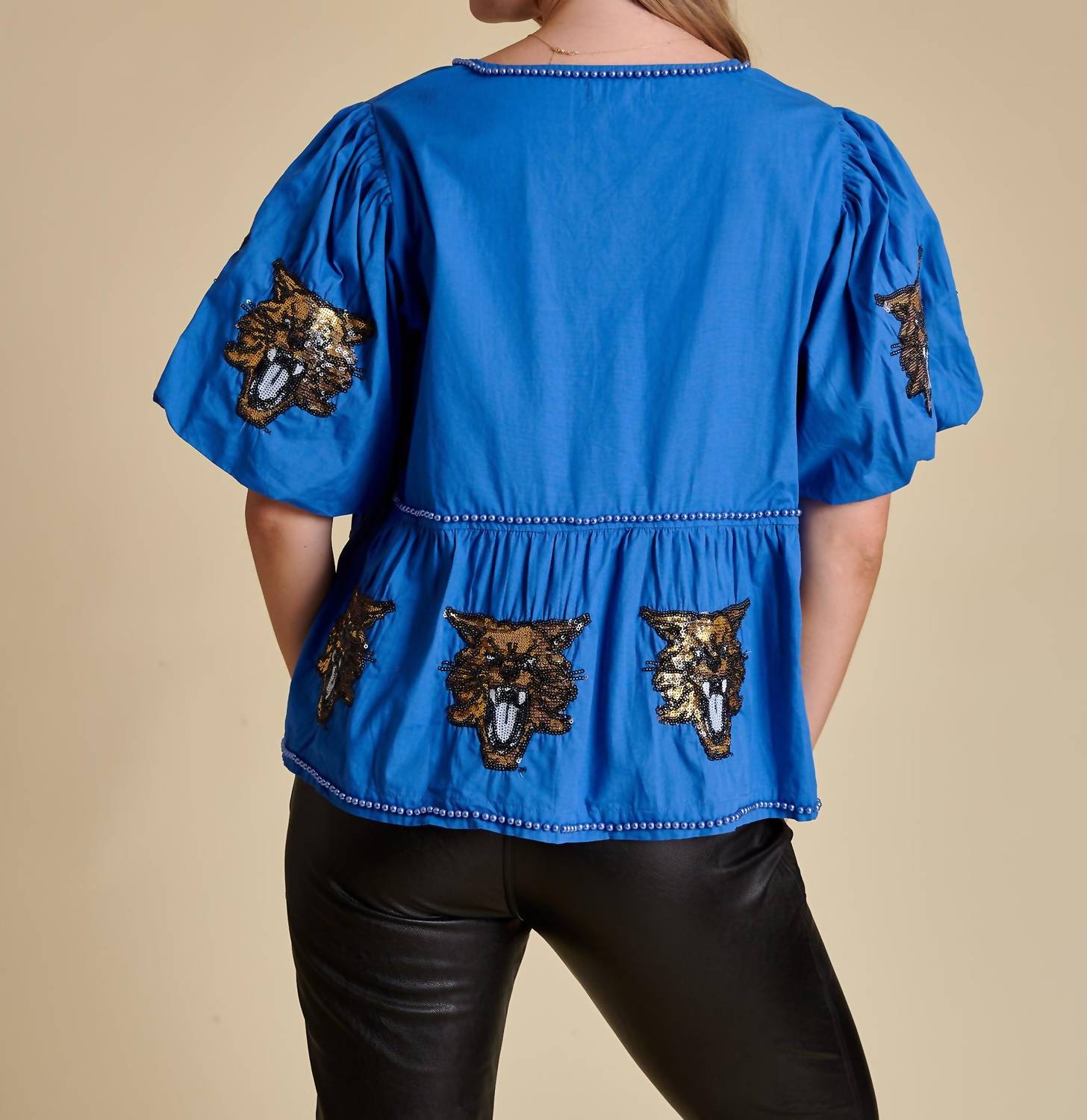 The short sleeve tee you'll want in every color. Elevate your game day style with The Puff Sleeve Peplum Top Kentucky by Stewart Simmons. This blue short-sleeve top, featuring a squareneck and a graphic pattern, combines a flattering peplum silhouette with the elegance of puff sleeves for a chic look. Made from pure cotton, it offers comfort and effortless style, suitable for various occasions. Closure: Pull-on. Care: Machine wash and lay flat to dry. Measurements for size small: Length 23”, Width 20 1/1”.