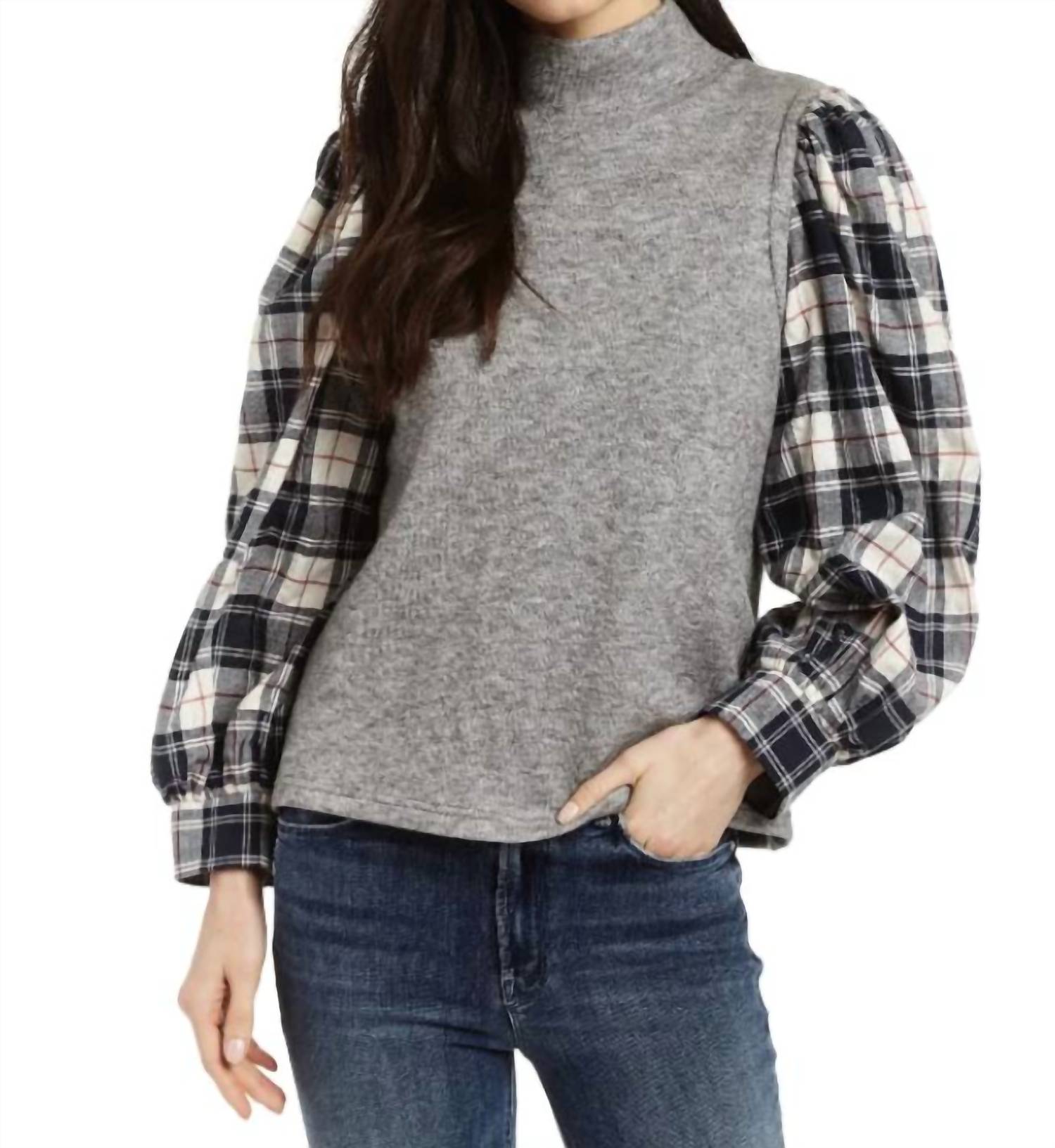 Long sleeve Top with navy, red & ivory plaid cotton sleeves and heather grey mock turtleneck sweater body. Great paired with your favorite jeans for the ultimate fall look.