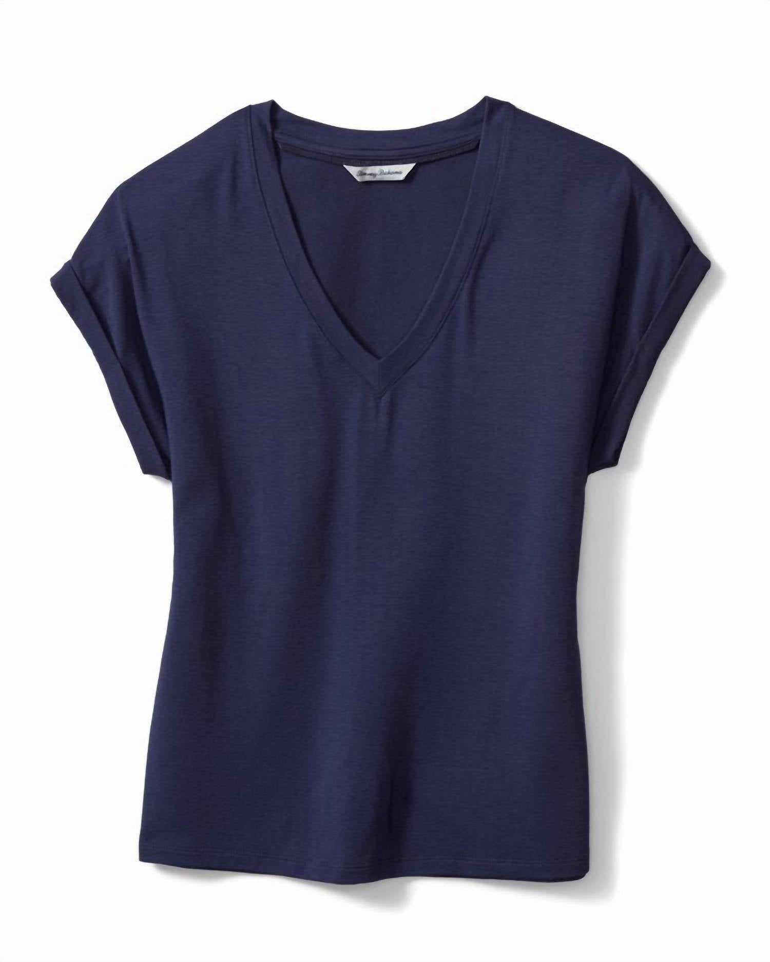 Introducing the Jersey V-Neck Tee by TOMMY BAHAMA in a sophisticated navy hue. This short sleeve top marries comfort with style, featuring a modal-blend composition of 67% TENCEL™ Modal, 28% polyester, and 5% spandex, offering a luxurious feel with just the right amount of stretch. The tee's V-neckline is designed to flatter and elongate the body, perfect for pairing with short length necklaces. With a convenient pull-on closure and a length of 25" from shoulder to hem (based on a size S), it's ideal for a casual, easy fit. Crafted from sustainable materials and imported, this tee is machine washable on a gentle cycle and can be tumble dried low or dry cleaned for effortless care.