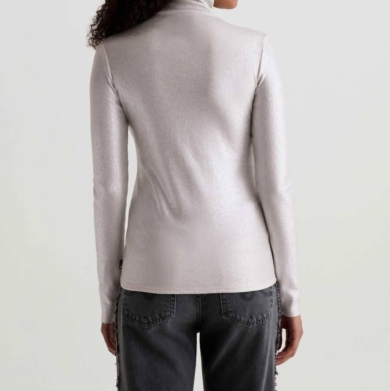 A long sleeve top you can wear with denim, skirts, well... just about anything! Introducing the Chels Turtleneck Top by AG Jeans, a powder/silver essential crafted for elegance and comfort. This solid long-sleeve tee is composed of 65% Polyester, 32% Rayon, and 3% Elastane, featuring a form-fitting rib-knit construction with a turtleneck silhouette perfect for a dinner party or any sophisticated event. The slim, pull-on design offers a chest measurement of 14.5 inches and a length of 23 inches in size X-Small. Care instructions advise hand wash cold to maintain its exquisite structure.