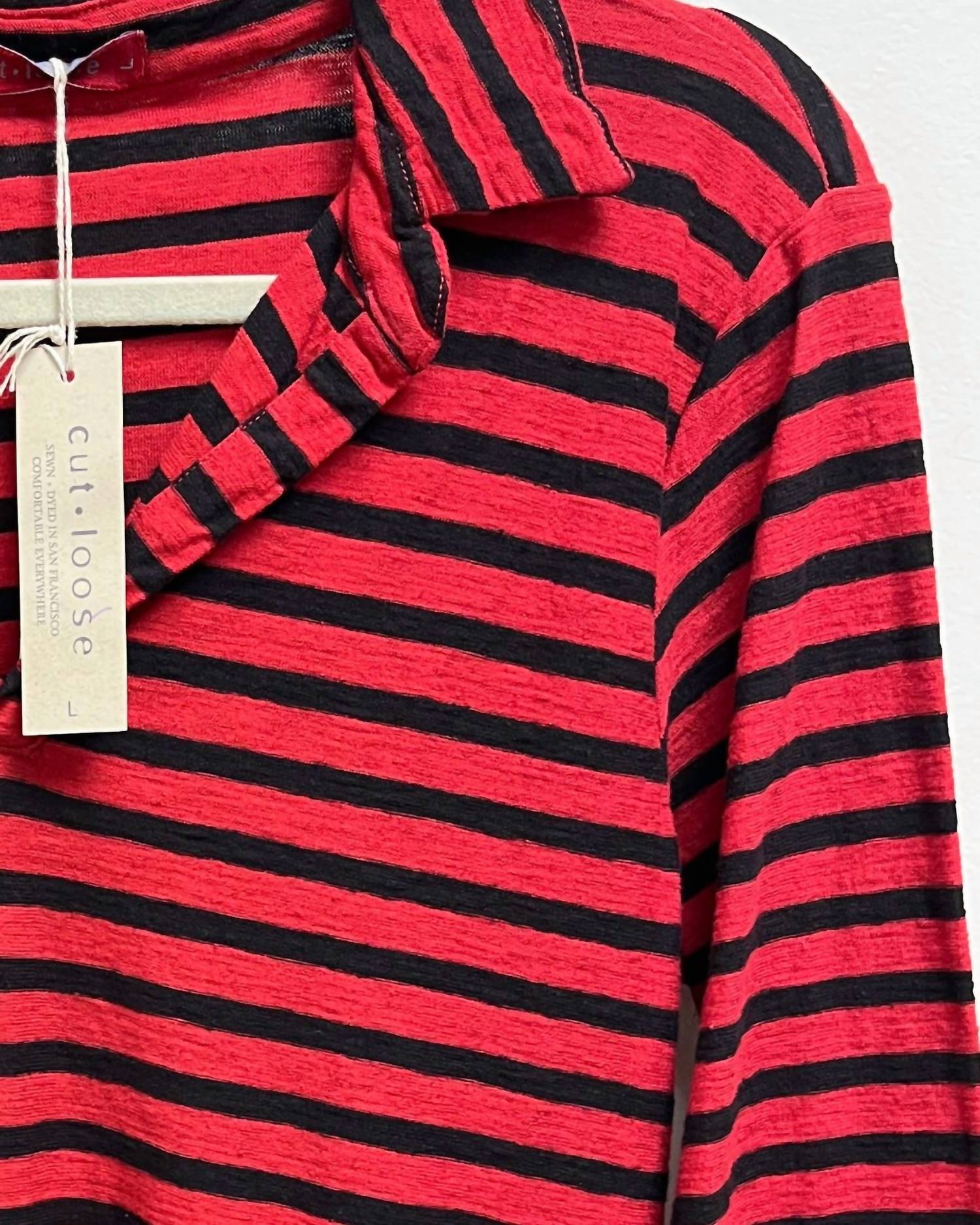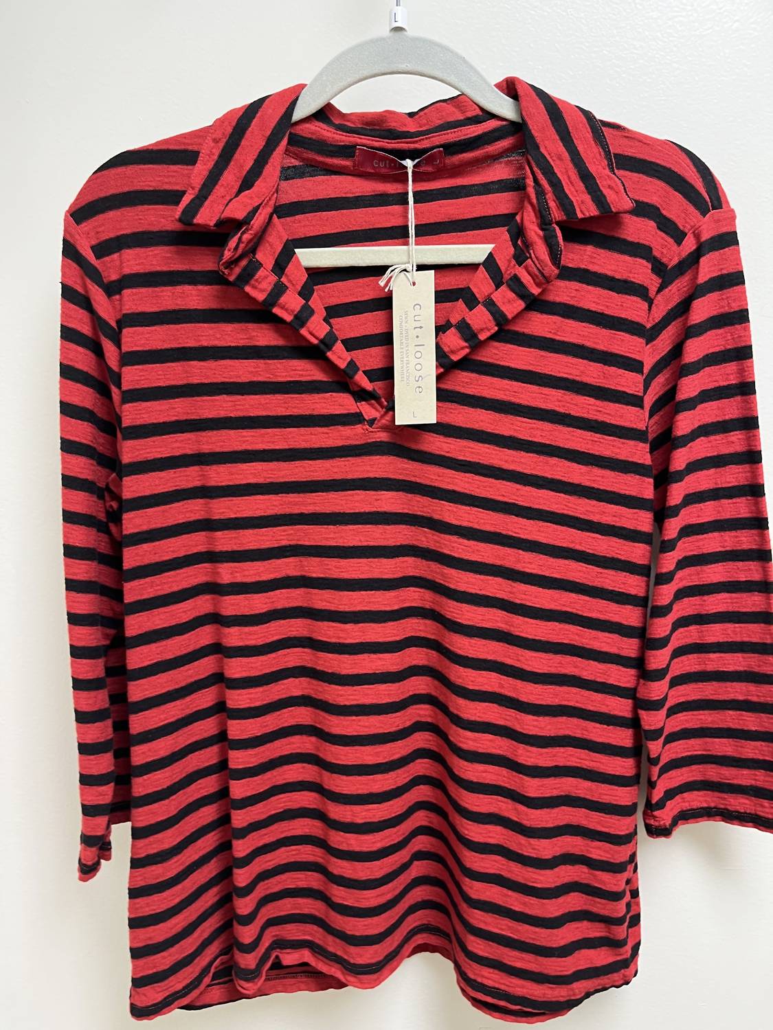 Great fit, cute design, soft fabric. You'll love everything about this long sleeve tee. Elevate your holiday wardrobe with the Women's Striped V-neck Long Sleeve Top with Collar by cut loose, designed for Christmas festivities. This vibrant top in Holiday Red features three-quarter sleeves and a stylish collar, making it perfect for birthday celebrations or fall outings. Embrace the season's maximalist trend with this wardrobe staple.