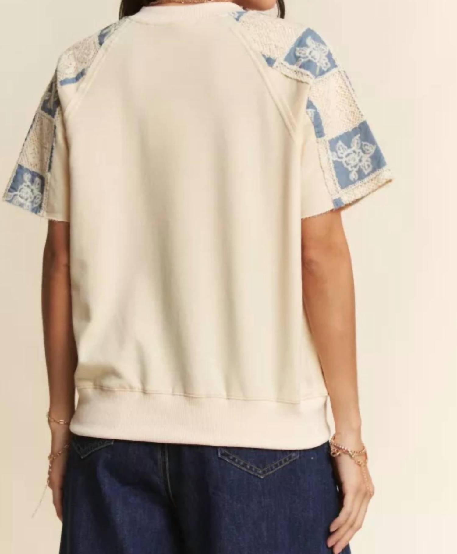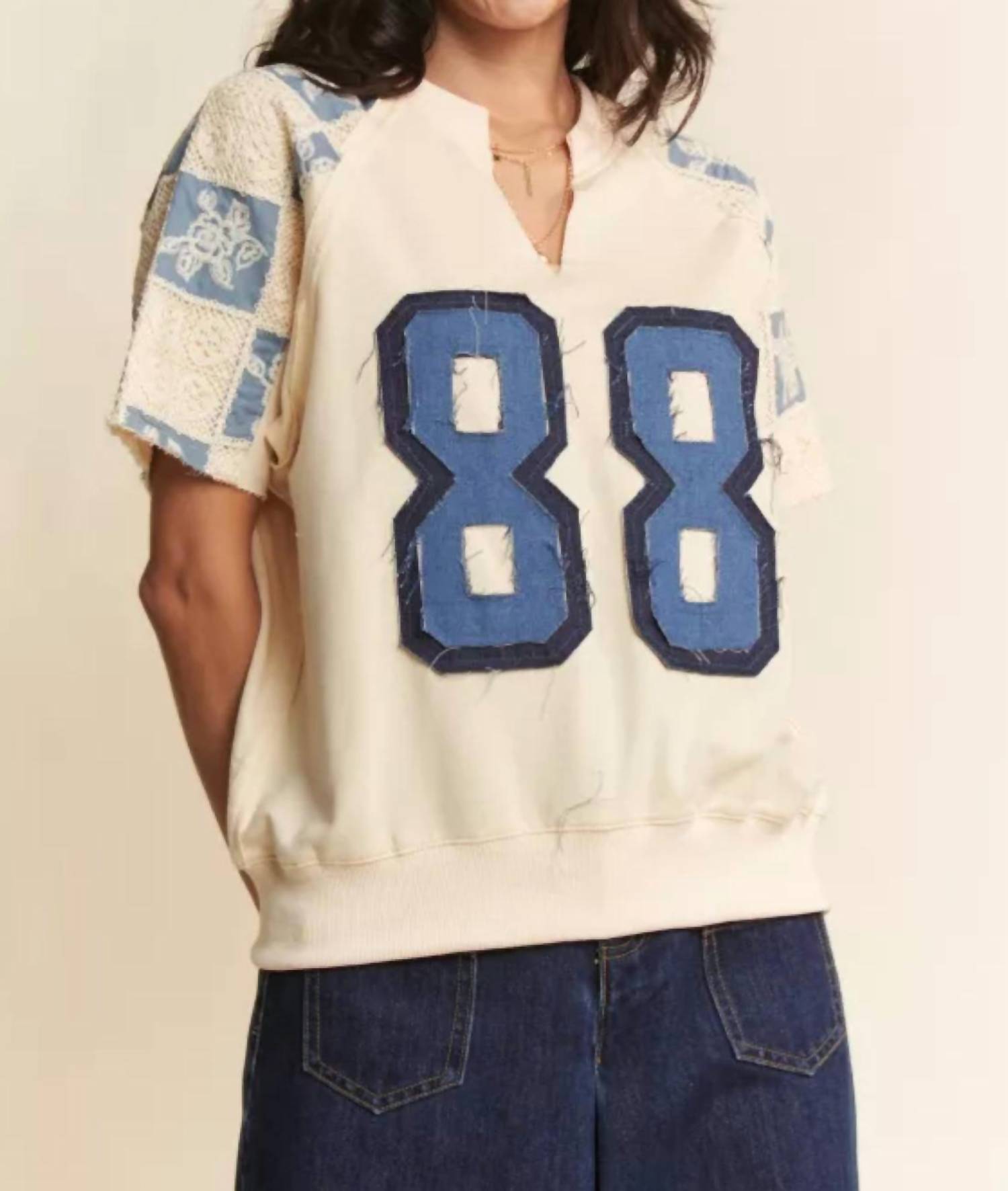 The short sleeve tee you'll want in every color. Embrace trendy streetwear style with the Number One Fan Top by DAVI & DANI, perfect for back-to-school and summer occasions. This cream denim blue tee features short sleeves and a standout graphic design, combining a unique denim number patch with delicate crochet floral embroidery. Made from French terry sweatshirt material, it offers a comfortable fit with a pull-on closure and classic crewneck. Easy to maintain, simply machine wash and line dry for lasting wear. Designed specifically for women, it’s an on-trend piece to showcase your fashion-forward support.