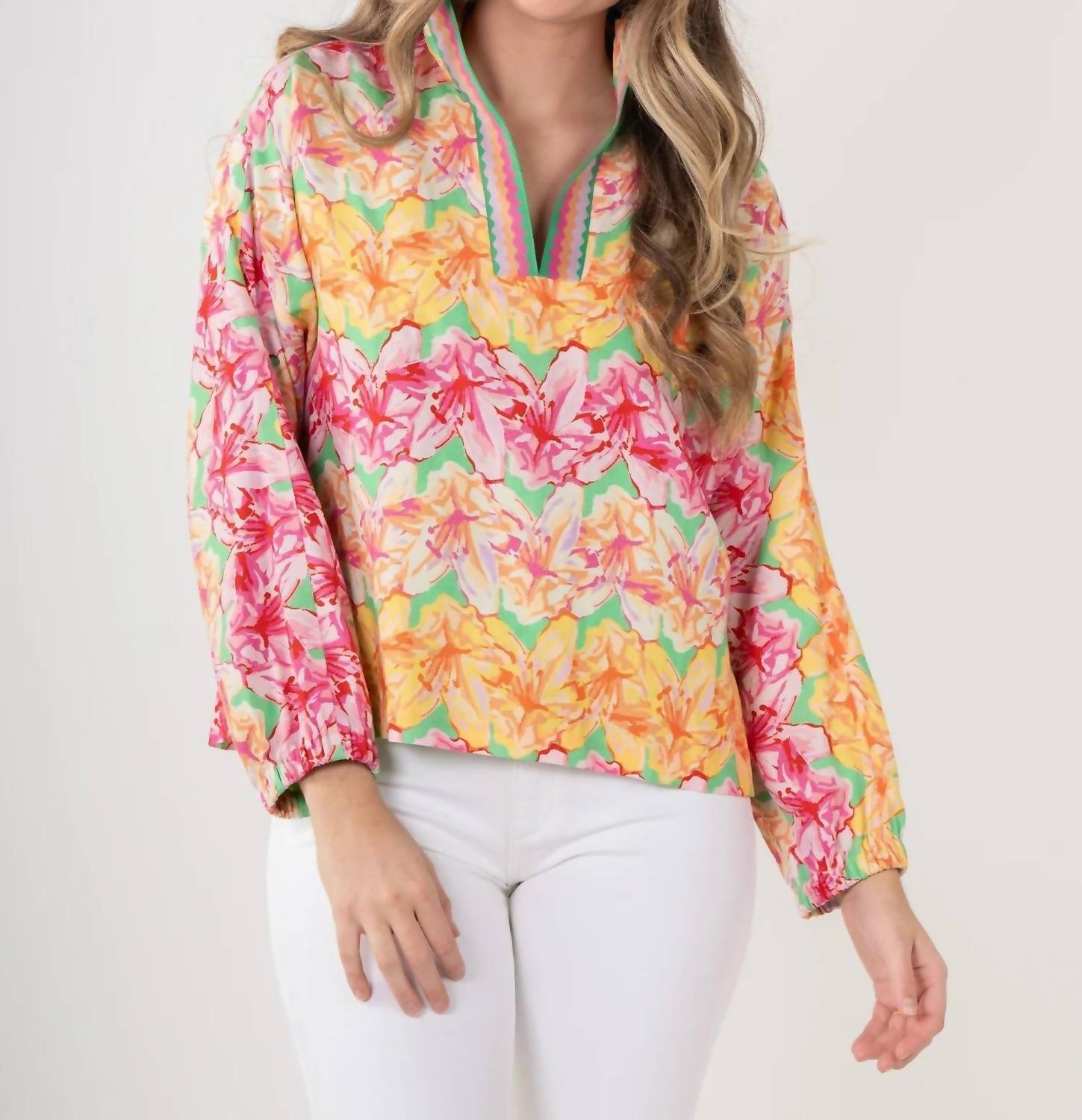 Look no further, you just found your perfect tee! The Poppy Pop-Over Azalea is a top made of 70% rayon and 30% linen, with a polyester lining. It has a stand collar with a notched neckline, long elastic dolman sleeves with gathered cuffs, and a loose-fitting silhouette. The top features a pattern of pink, orange, yellow, and green painterly azaleas. It is designed for dry cleaning only or spot cleaning with cold water and a white cloth. Copy