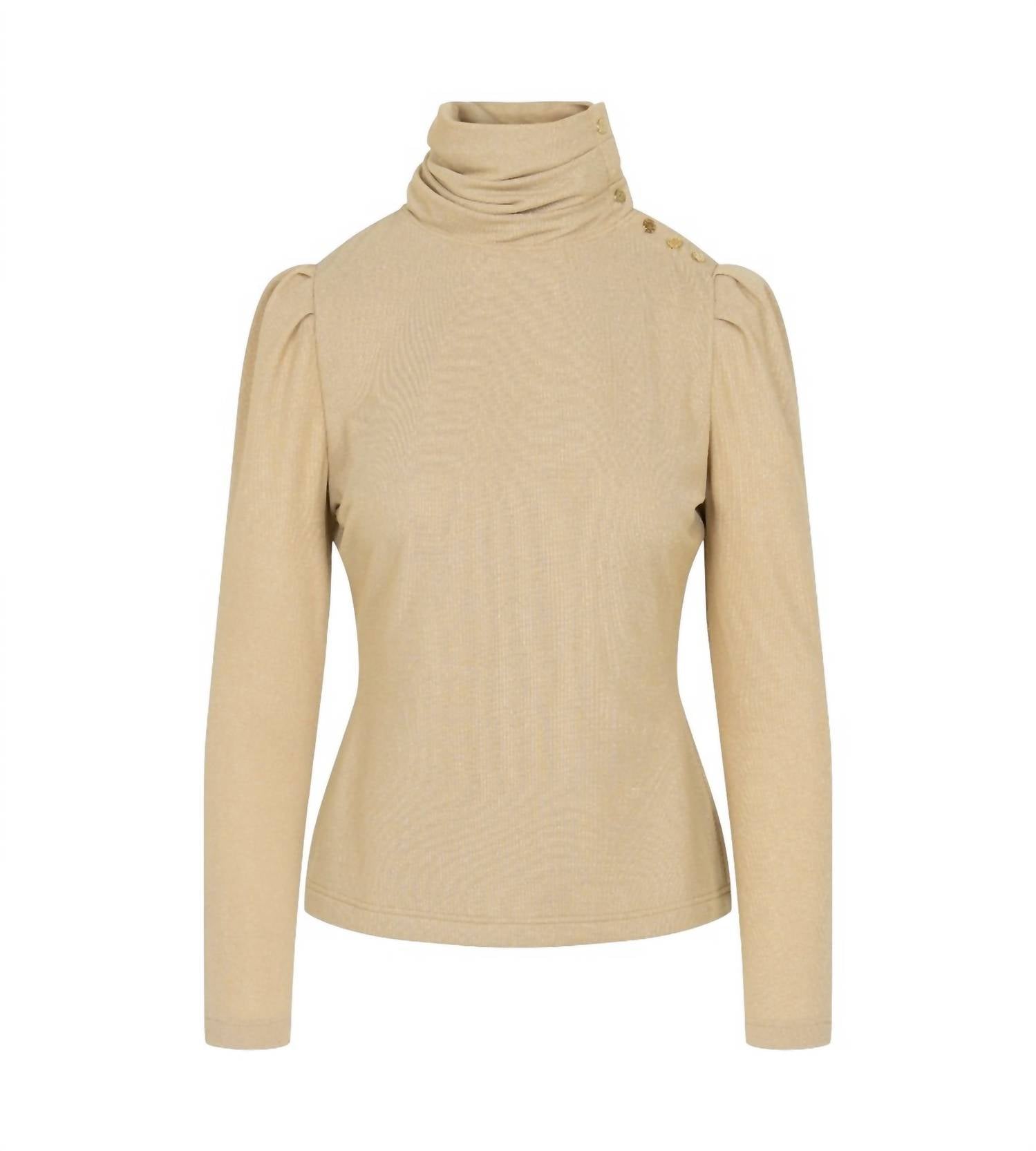 Great fit, cute design, soft fabric. You'll love everything about this long sleeve tee. Introducing the Tessa Turtleneck Long Sleeve Top by Emily McCarthy, a chic addition to your fall wardrobe in Metallic Gold Knit. This top features long sleeves adorned with gold button details and a gathered mock neck with a gold button opening. Composed of 72% Nylon, 16% Polyester, 8% Metallic, and 4% Spandex, it offers a flattering tailored silhouette and a pull-on closure for ease. Care for this elegant piece by hand washing with a gentle detergent in cold water and line drying to preserve its vibrant color and shape.