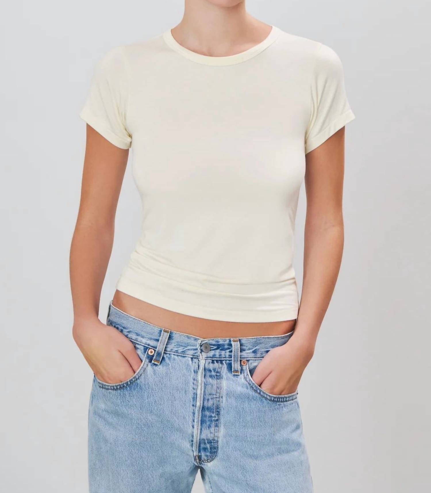 The short sleeve tee you'll want in every color. Discover the Fitted Crewneck Short Sleeve T-shirt by Eterne, a minimalist essential in elegant ivory. This women's tee is meticulously crafted from a jersey cotton blend, featuring 96% modal and 4% spandex for a slim fit and full-length design. The solid pattern with a crewneck neckline promises comfort and style, while the pull-on closure ensures easy wear. Care is simple with machine wash and tumble dry instructions, making it a practical choice for summer sophistication.
