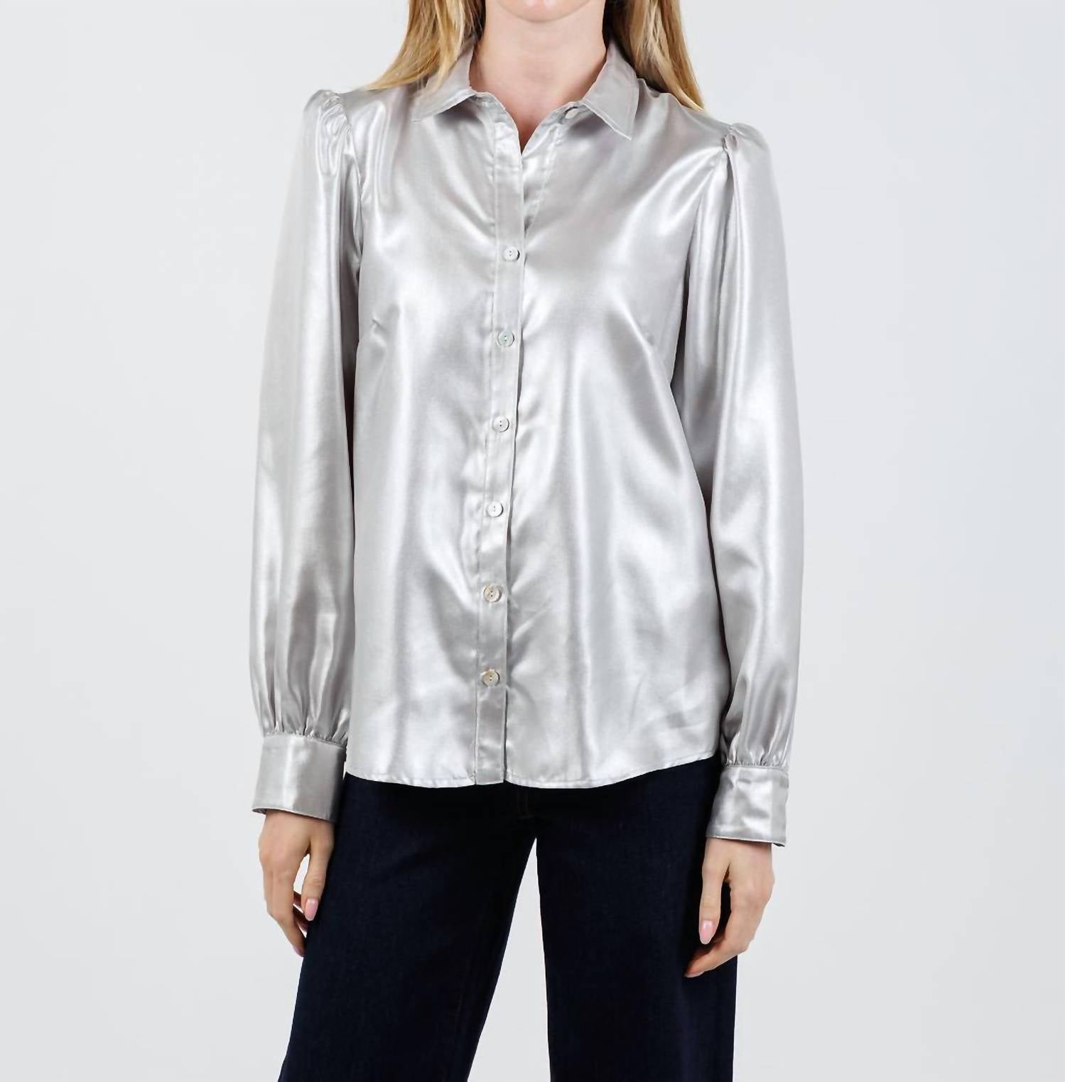 The perfect long sleeve tee that goes with just about anything. Elevate your wardrobe with the Collette Button Front Shirt by Finley, a shimmering silver piece perfect for an evening event. This long sleeve shirt with a spread collar and button closure measures approximately 27 inches from the shoulder, featuring a relaxed fit for comfortable elegance. Crafted from 100% polyester with a striking metallic finish, this piece is made in the USA. Care is simple—dry clean only. Emily, standing at 5'8" with a 30" bust, 24.5" waist, wears a size XS.