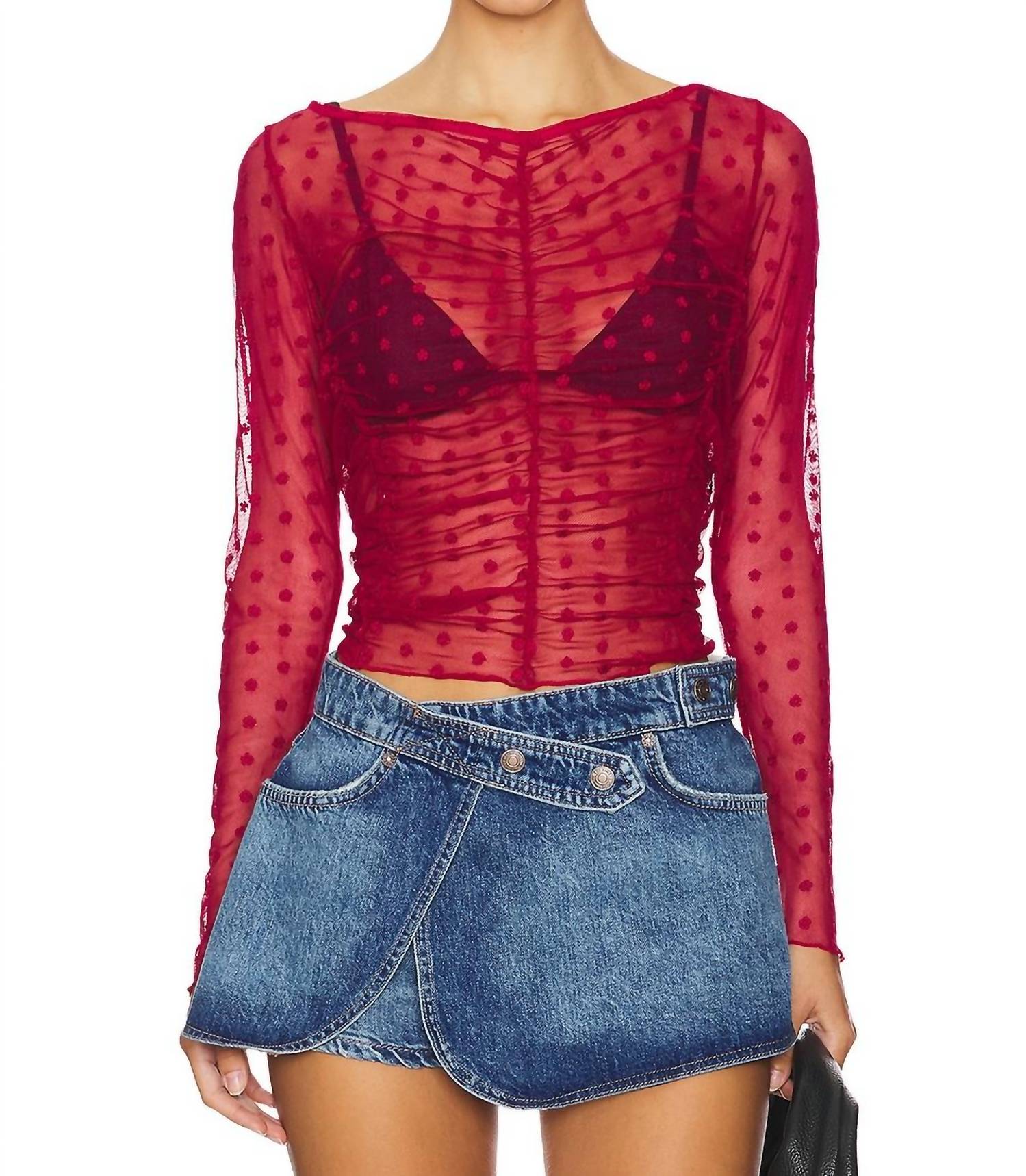 The perfect long sleeve tee that goes with just about anything. Introducing the Most Likely Layering Top by Free People, styled with a delicate Glass Roses hue for a boho chic vibe. This women's top features sheer long fitted sleeves with ruched detailing and lettuce-edge trim, all beautifully accented with embroidered daisies. Crafted from 100% textured nylon, it offers a comfortable pull-on closure and elegant boatneck design. Care: Dry clean only. Perfect for a vacation or holiday occasion, it pairs effortlessly with your favorite bralette and jeans for an easygoing yet stunning look.