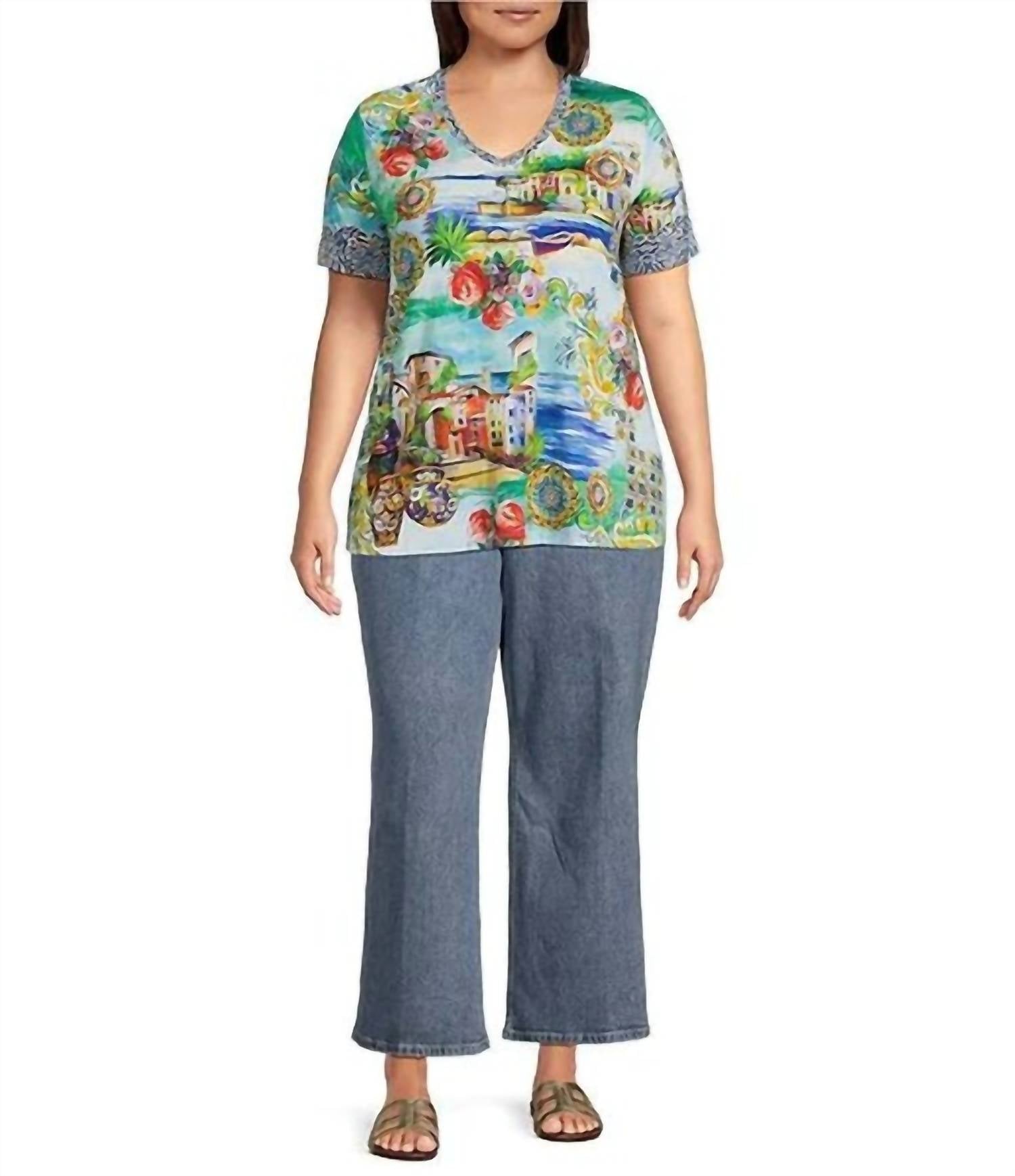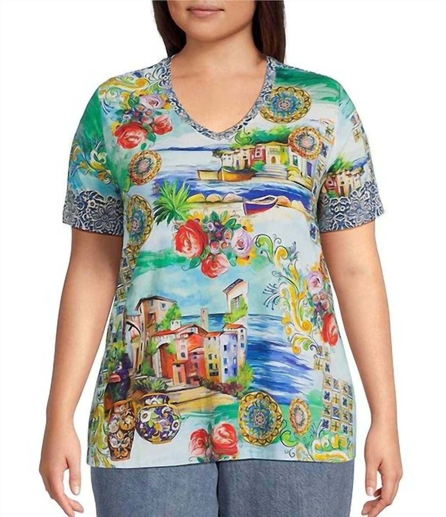 The short sleeve tee you'll want in every color. Experience effortless style with the Johnny Was Janie Favorite Short Sleeve V-Neck Tee in a graphic Christy hue, ideal for your summer vacation. This plus-size tee features short sleeves and is crafted from a soft blend of 95% Rayon and 5% Spandex, offering a hint of stretch for casual comfort. Designed with a classic V-neckline and a pull-on closure, it effortlessly elevates your everyday look. Care for this stylish piece by machine washing as needed.