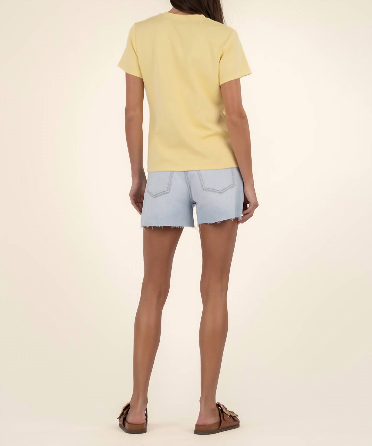 This classic, short sleeve tee will be your go-to staple this season and beyond. Discover the Remington Scoop Neck Top by KUT FROM THE KLOTH, a must-have in Butter Yellow for a chic, casual addition to your summer wardrobe. Designed with short sleeves, this minimalist tee is crafted from a supersoft blend of 70% Modal and 30% Polyester, offering both comfort and style. With a high point shoulder length of 24 inches, this solid pattern top is perfect for any vacation occasion. Closure: Pull-on style. Care: Machine wash and tumble dry for easy maintenance.