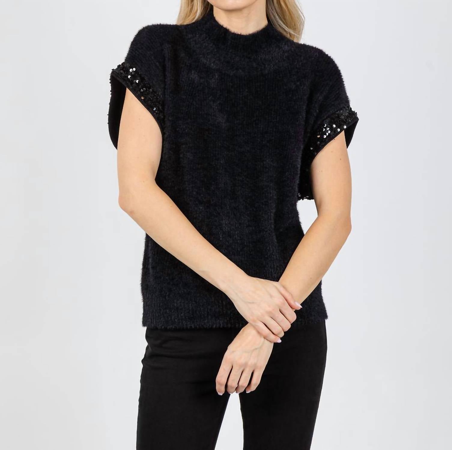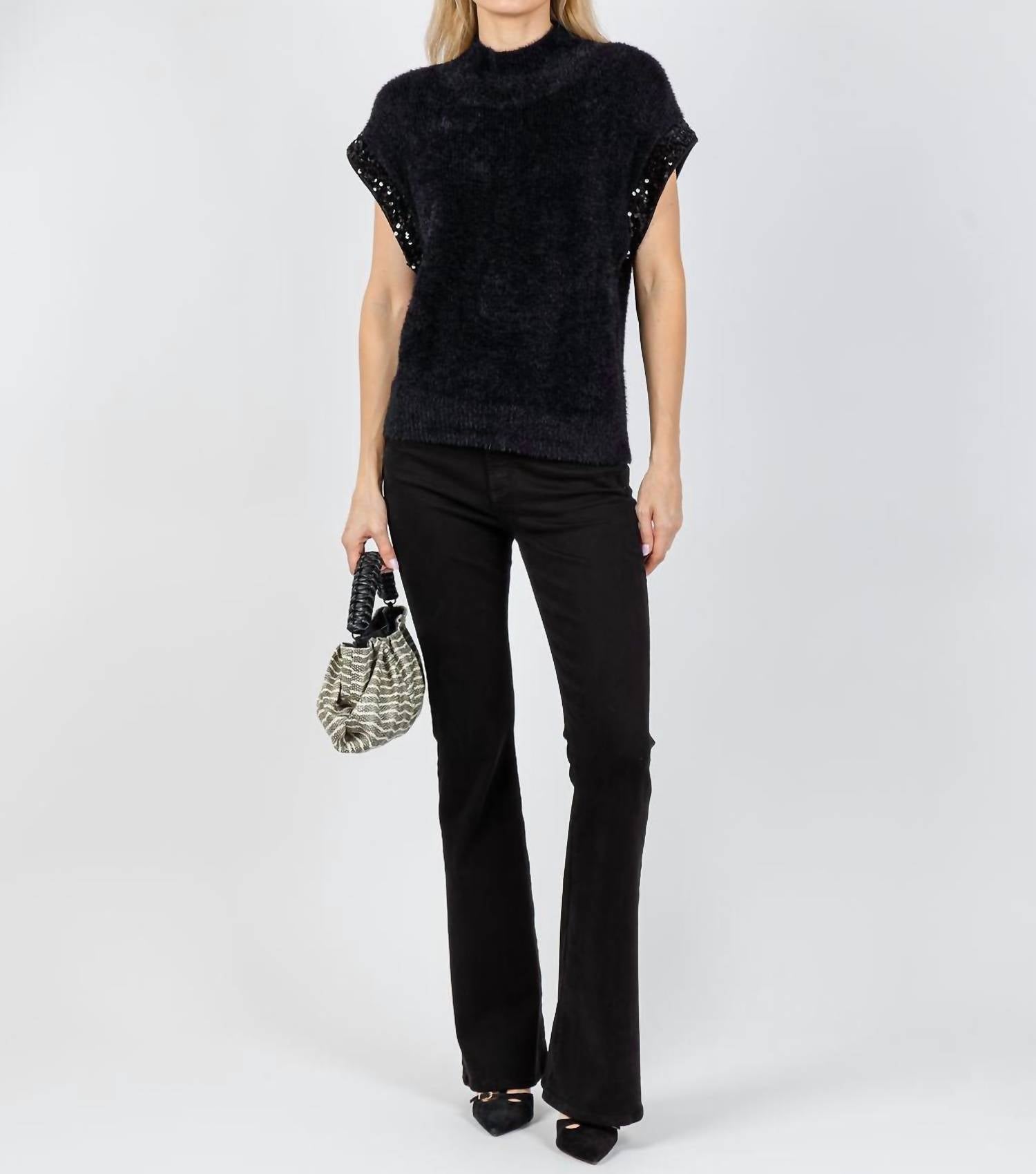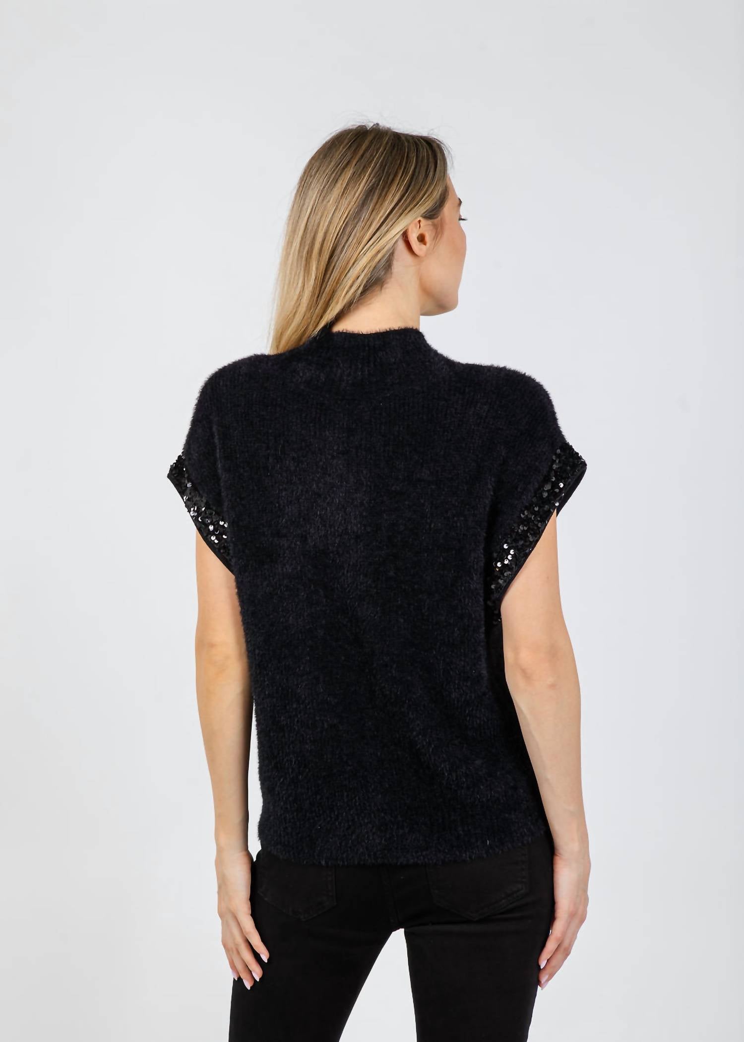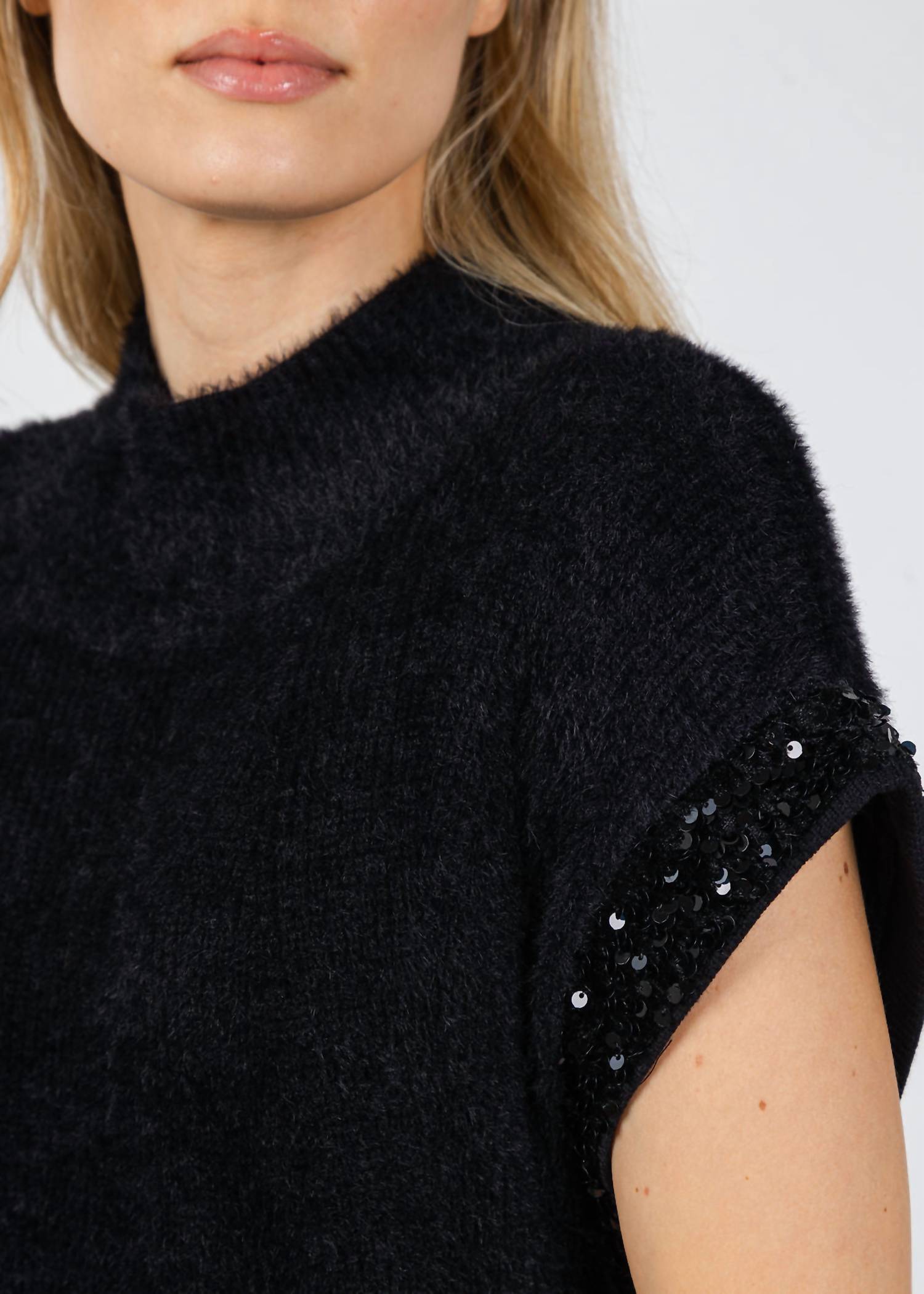 The perfect long sleeve tee that goes with just about anything. The Yura Sequin Top by Melissa Nepton is a chic black evening piece that seamlessly combines comfort with elegance. Crafted from 100% polyamide, this top showcases an ultra-soft textured knit with short sleeves adorned with sequin-embellished cuffs. The structured mock neck and pull-on closure add a modern touch, while its relaxed fit ensures comfort throughout your evening events. Made with ease of care in mind, this top is machine washable. Model wears size XS with dimensions: 5’8” height, 33” bust, 25” waist, 36” hips.