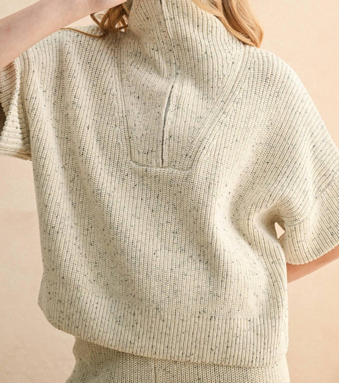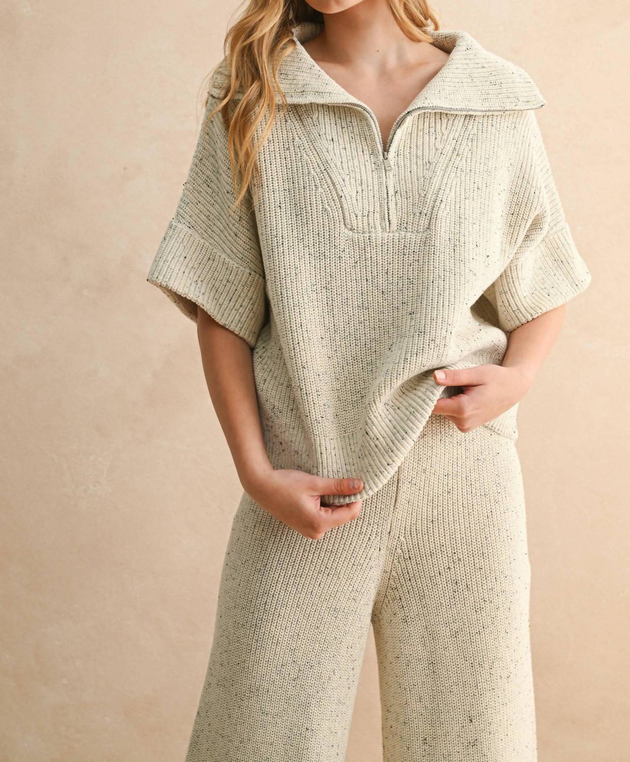 Look no further, you just found your perfect tee! Elevate your spring wardrobe with the Half Zip Short Sleeve Knitted Top by MIOU MUSE, offered in a textured salt and pepper pattern for a chic twist. This women's top features a stylish collar and convenient half zip design with short sleeves, making it perfect for versatile wear. Closure: Pull on. Ideal for any occasion, this piece combines fashion with function.
