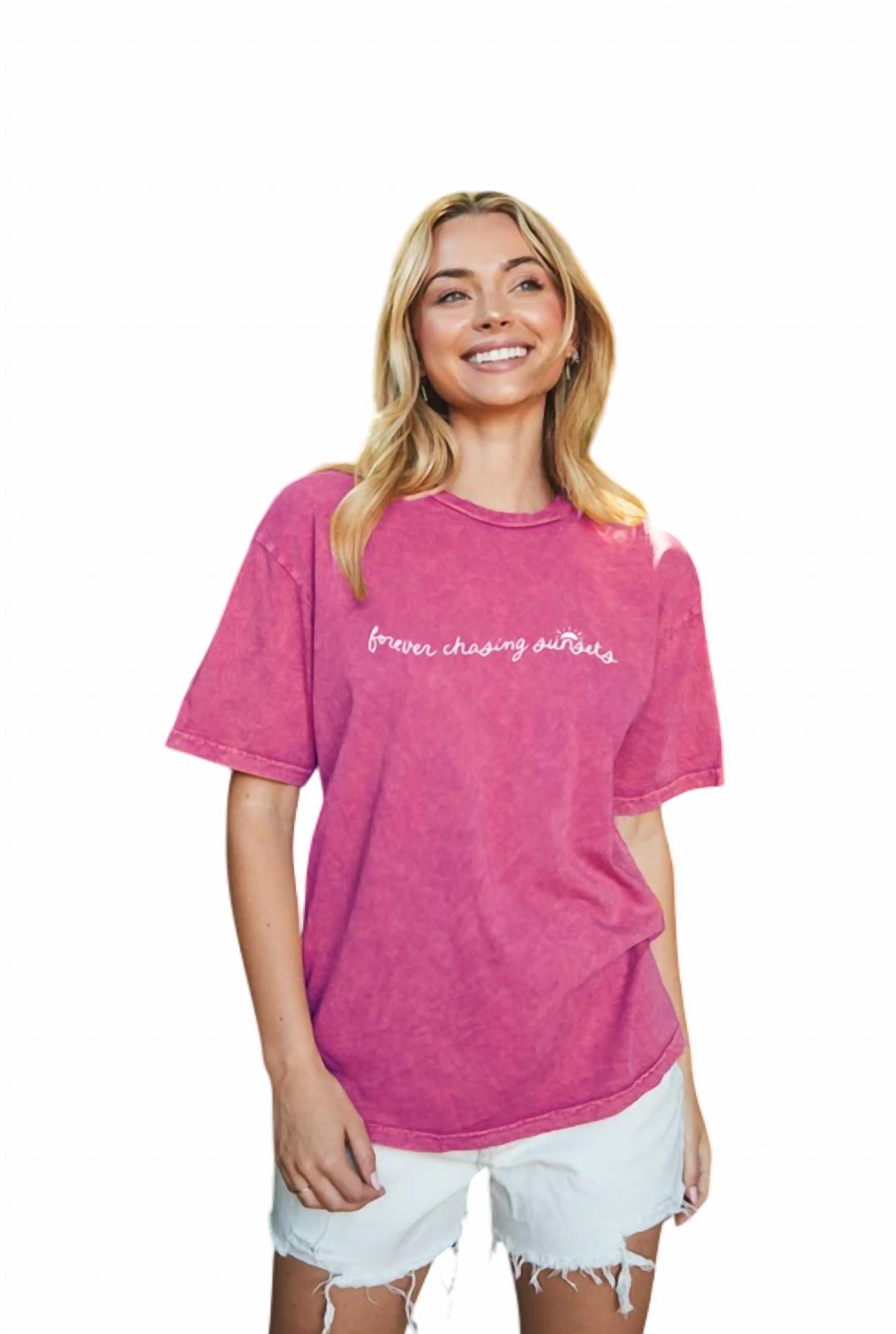 Look no further, you just found your perfect tee! Introducing the Forever Chasing Sunsets Mineral Graphic Tee by OAT COLLECTIVE, a vibrant fuchsia piece perfect for your casual wardrobe. This short sleeve tee is crafted from 100% premium cotton jersey, ensuring a soft and comfortable fit. The garment features a crewneck design and a unique mineral wash finish, complemented by screen printing using water-based ink. Easy to wear with its pull-on closure, this tee is an effortless blend of style and comfort.
