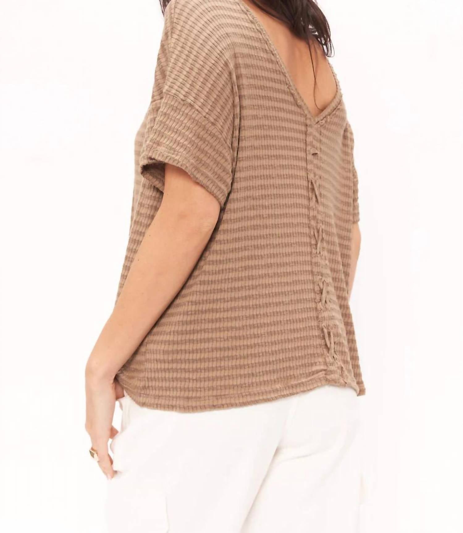 Look no further, you just found your perfect tee! Elevate your vacation wardrobe with the Isadora Lace-up Tee by PROJECT SOCIAL T, a must-have in the calming Tea Leaves shade. This short sleeve tee boasts a relaxed, textured fit and features a tonal striped rib fabric with a scoop neckline and chic drop shoulders. The standout design element is the plunge back silhouette, accentuated by a captivating center lace-up detail. Composed of 55% Rayon and 45% Cotton, this pull-on style offers both comfort and a vintage vibe, perfect for any holiday party.