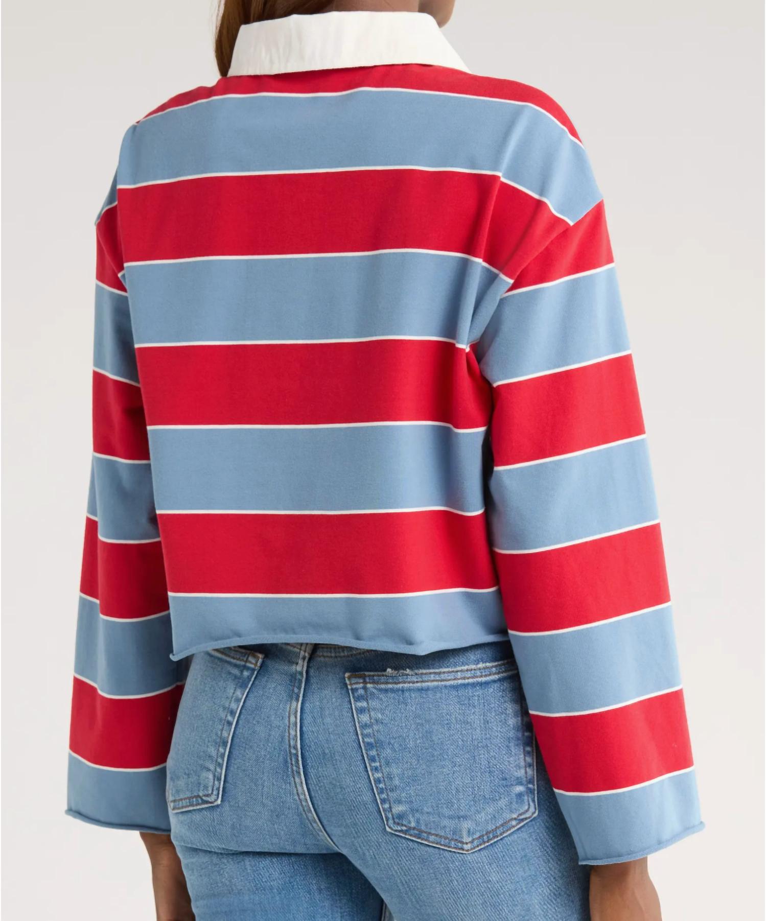The perfect long sleeve tee that goes with just about anything. Embrace a sporty vibe with the Cut Off Rugby Polo by RE/DONE, featuring long sleeves and a cropped boxy fit in bold Crimson Bluebird stripes. Made from a comfortable cotton blend (95% cotton, 5% spandex), this polo offers a classic point collar and a convenient button half placket closure. Perfect for a 90s fashion-inspired vacation, the design runs true to size with clear sizing options from XS to L. Care is hassle-free with machine wash and tumble dry instructions.