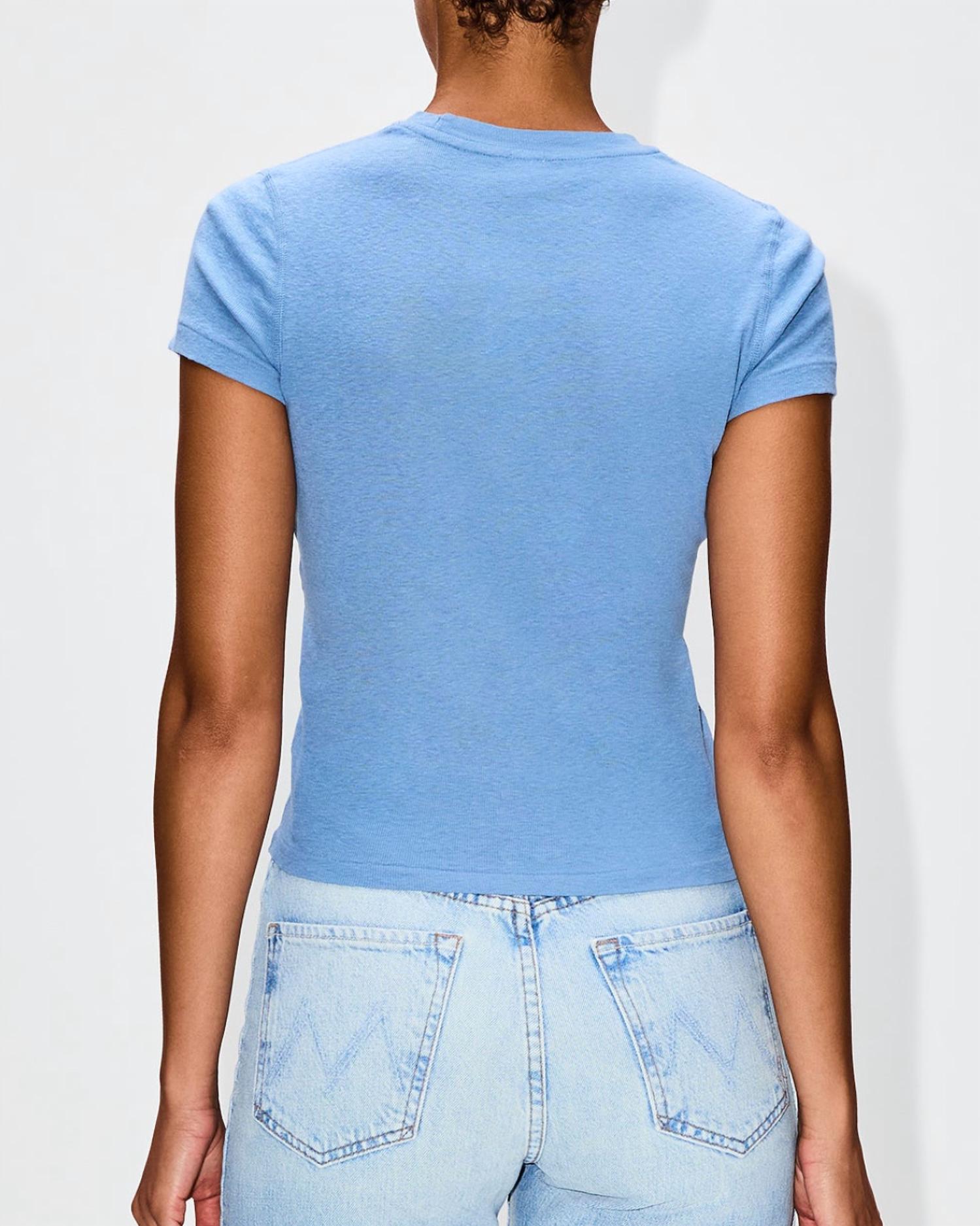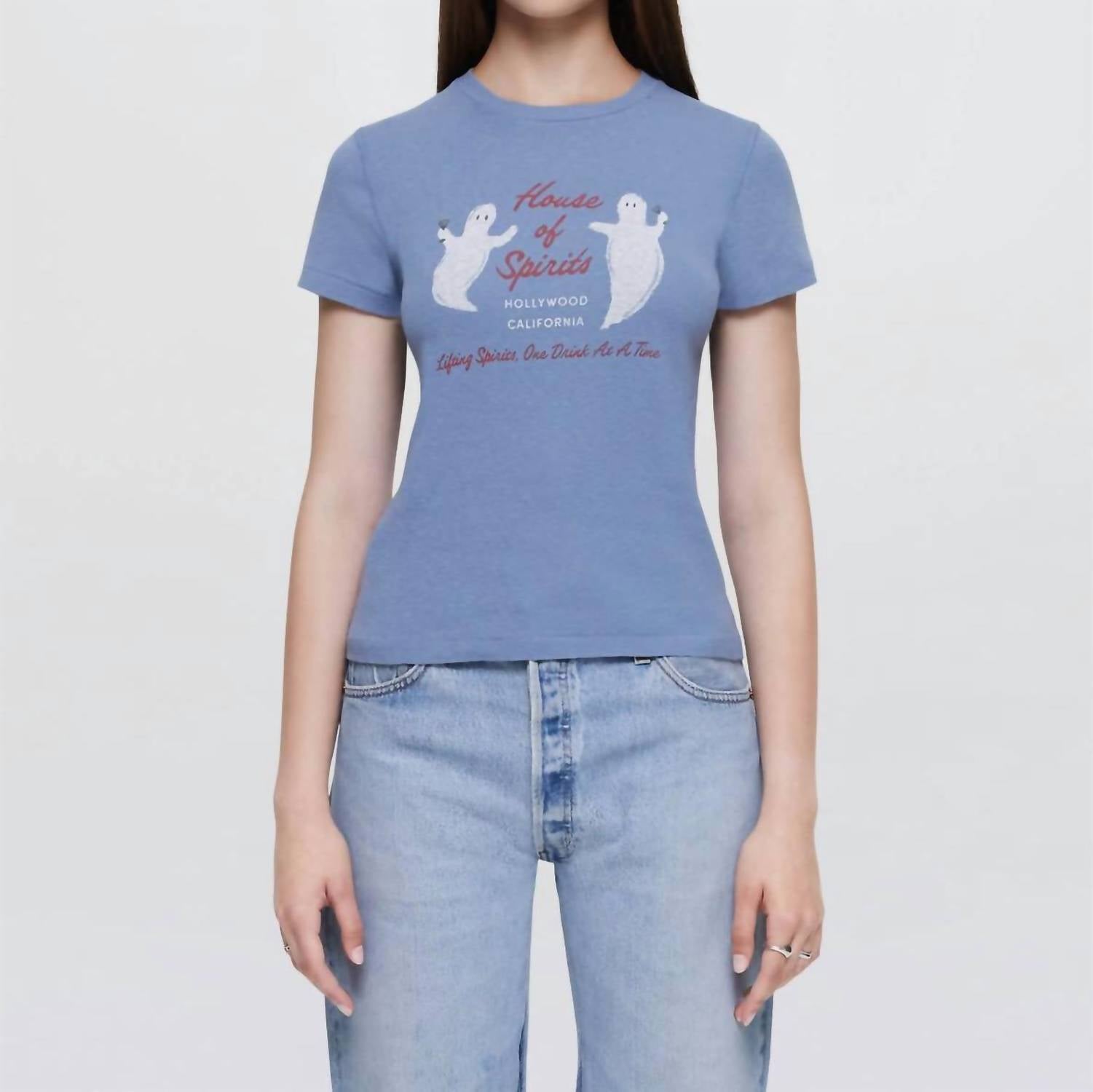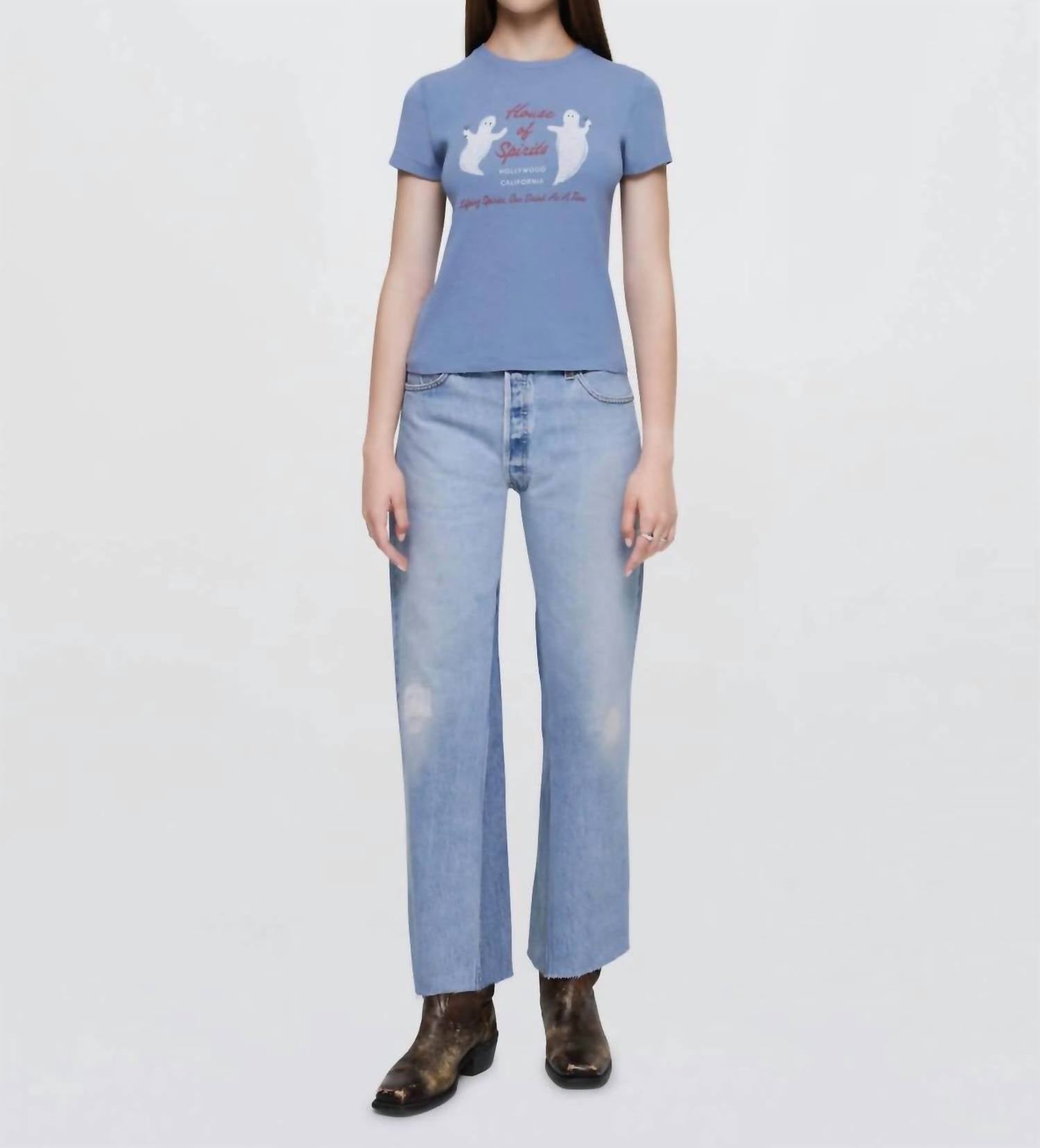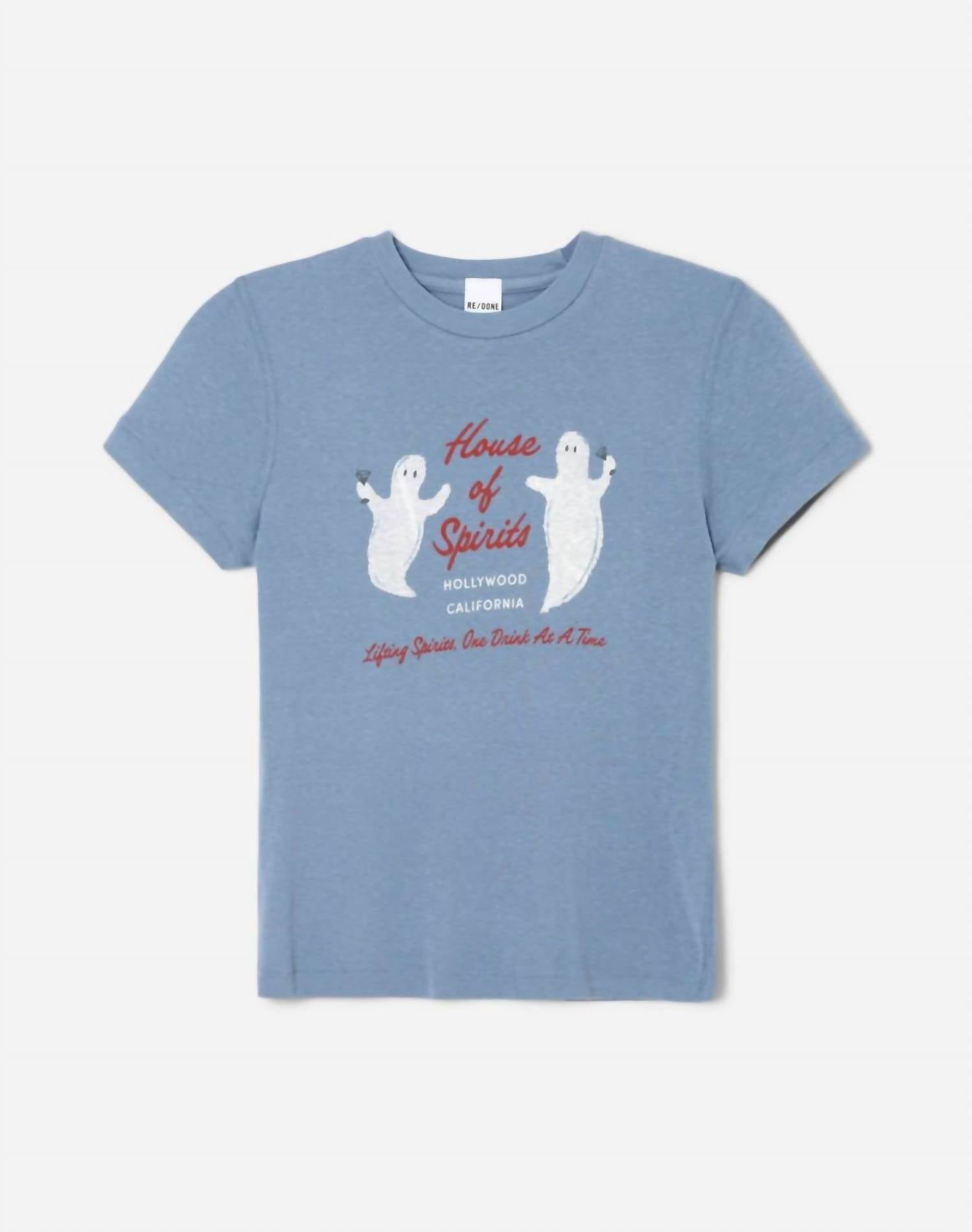 The short sleeve tee you'll want in every color. Introducing the Women's House Of Spirits Top by RE/DONE, a playful vintage-inspired tee in Stone Blue. This short sleeve tee is crafted from a cotton blend, combining 70% cotton and 30% recycled cotton for softness and sustainability. With a fun "House of Spirits" graphic adding a spooky yet charming touch, it features a crewneck design and a fitted silhouette, perfect for spring streetwear or vacation days. Closure: Pull on. Care: Hand wash, lay flat to dry.