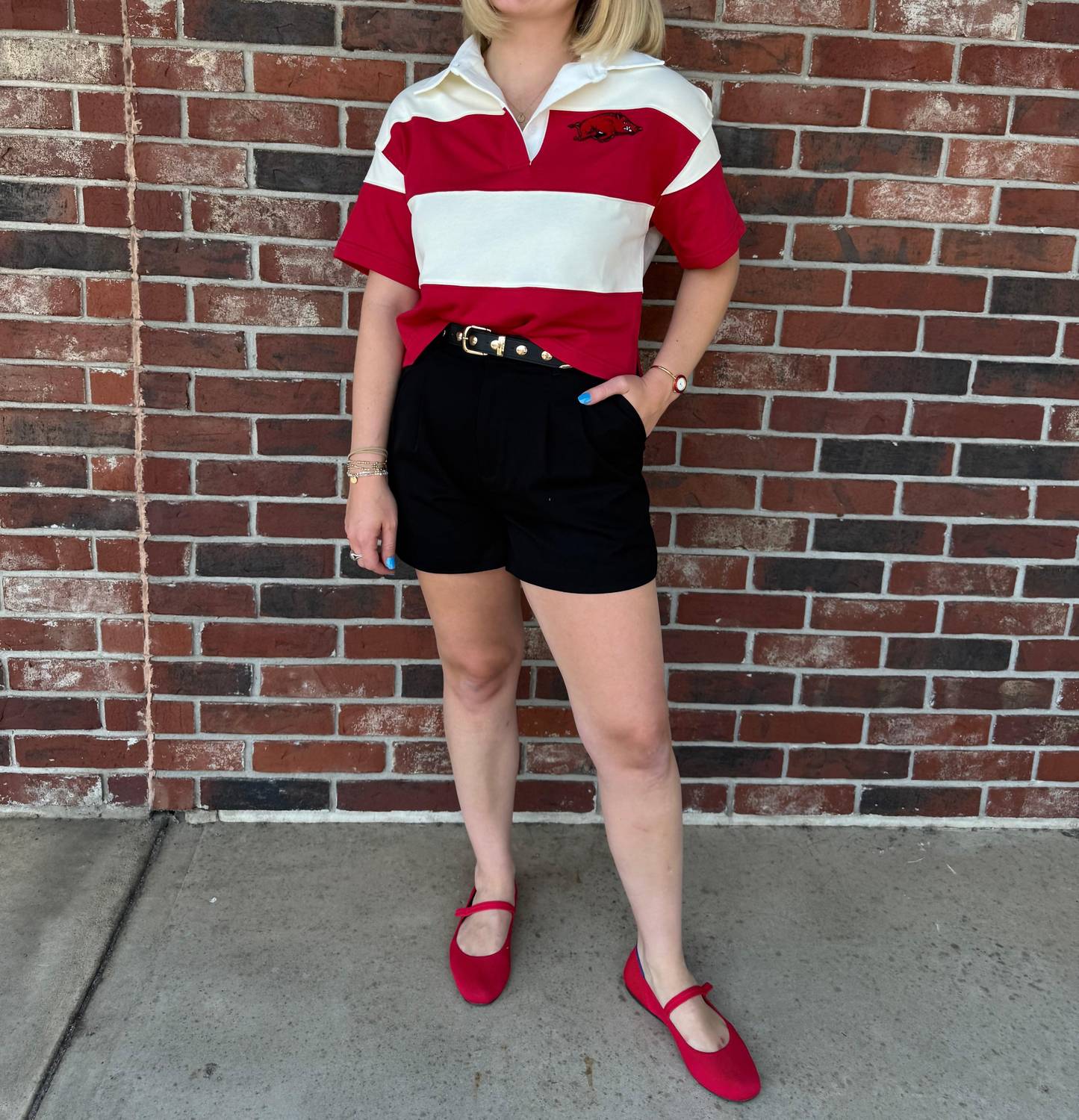 This classic, short sleeve tee will be your go-to staple this season and beyond. Show your Razorbacks pride with the Stewart Simmons Short Sleeve Rugby Top in Arkansas colors, perfect for game day excitement. Crafted with durability in mind, this rugby-style top features a classic collar and pull-on closure, keeping you effortlessly stylish and comfortable. Care is a breeze with machine wash and line dry instructions. Support the Razorbacks with this essential fan gear piece in patterned design, tailored for women.