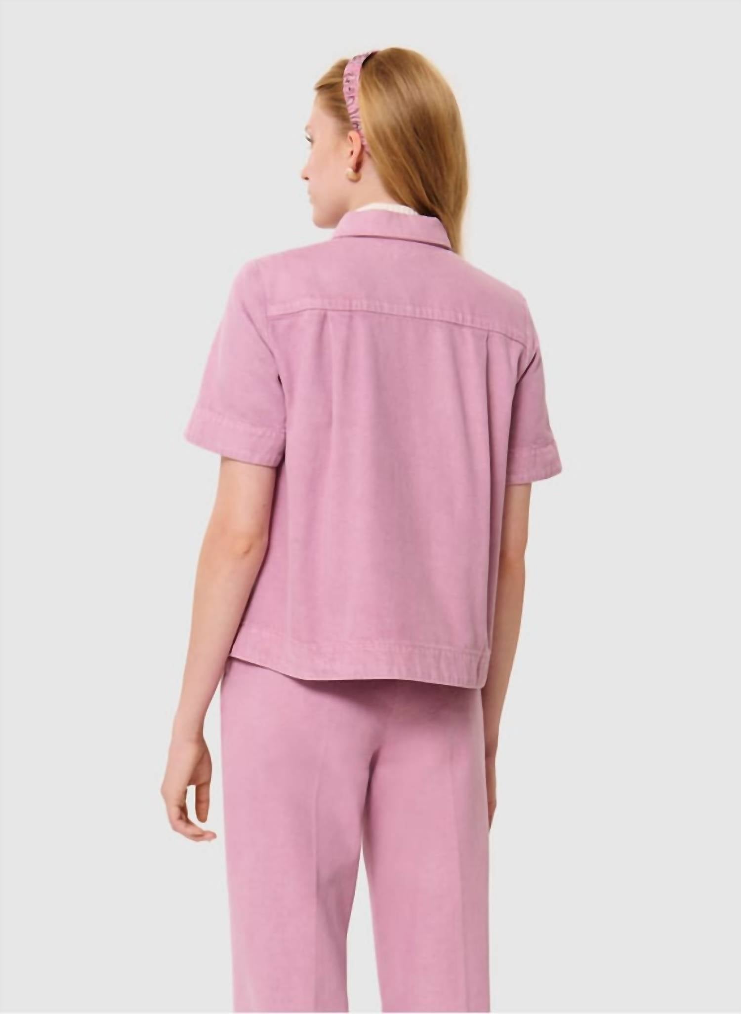 The short sleeve tee you'll want in every color. Introducing the Chemise Camila Denim Shirt by TARA JARMON, a chic piece in a delicate rose hue that embodies minimalist elegance. This short sleeve shirt is crafted from 100% cotton, offering a lightweight denim feel perfect for spring. It features a classic collar and a straight, slightly flared cut, secured with a snap button closure. Care instructions recommend washing at 30°C and laying flat to dry, avoiding bleach and tumble drying for longevity.