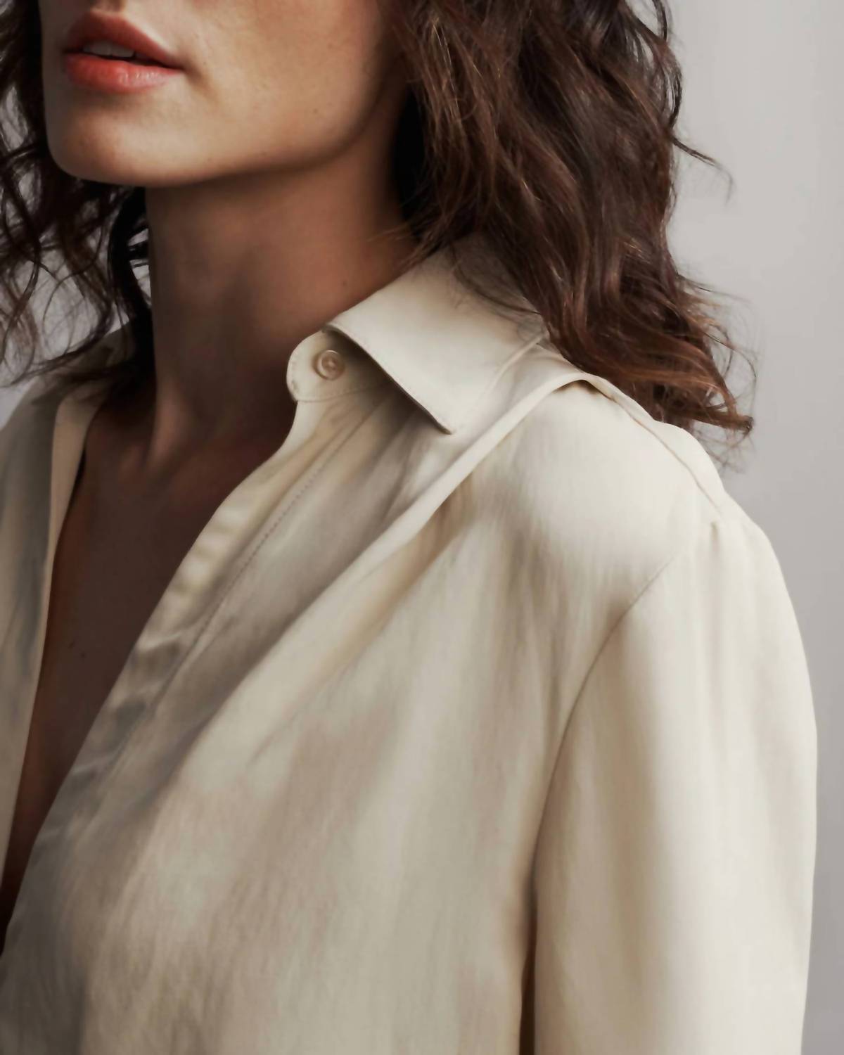 Great fit, cute design, soft fabric. You'll love everything about this long sleeve tee. Standout in French Butter. Slightly cropped, long sleeve top. Made from a luxurious blend of 76% viscose and 24% linen, offering the light sheen of satin with the sturdy feel of natural linen. Asymmetric button front and V neckline, accentuated by single pleats from the shoulders, bring a unique touch to this stylish piece. Care for it by handwashing, ensuring it remains a favorite for fall workwear and travel ensembles.