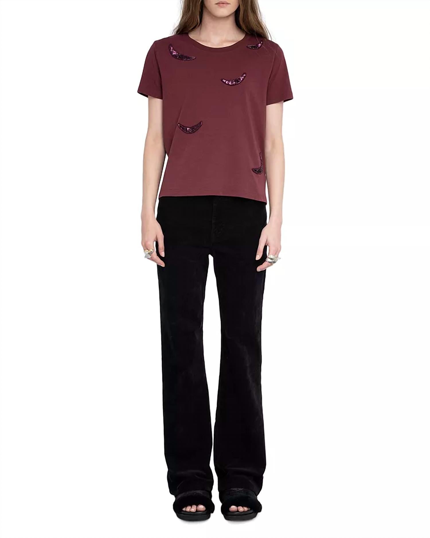 The short sleeve tee you'll want in every color. The Alys Embroidery Wings T-Shirt by Zadig & Voltaire is an effortlessly stylish essential, crafted from 100% cotton in a deep burgundy hue. This short sleeve tee showcases a striking embroidered wing motif at the front, merging casual comfort with distinctive detailing. Featuring a crewneck and a pull-on design, it's perfect for relaxed summer outings or holiday parties. Designed for a relaxed fit, this shirt adds a signature touch to any wardrobe.