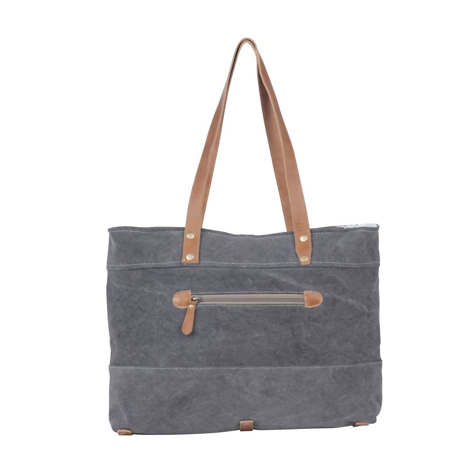 Aside from being the cutest bag ever, this tote is the perfect size to hold all of your vacation necessities. Pair this adorable bag with a flowing dress and some slides and you're all set! Meet the Women's Shadows Tote Bag by Myra Bags, a sleek addition to your accessory collection. Made from durable leather and cotton canvas, this grey tote offers ample space with its 19.5" width, 3.5" depth, and 12.5" height. Stay organized with multiple compartments, including an exterior zipper pocket and two interior pockets. The fully lined design features a convenient zip closure and an 11.5" handle for easy carrying.