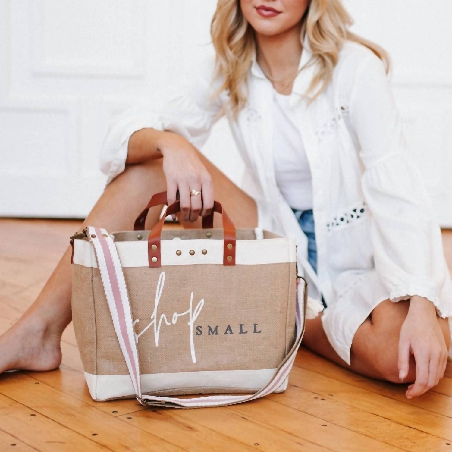 The carry-all tote bag of the season. Get in vacation mode with this perfectly sized tote bag that is the perfect accessory for beach days, pool parties, or sunset dinners. Show your love for small businesses and shopping small with the Shop Small Jute Crossbody Tote, your perfect everything hold-all for a day out on the town, running errands, or heading to the office or gym. This stylish and functional bag features a large main compartment with classic tote handles and a convenient removable crossbody strap, while the canvas bands add a pop of framing and style to the design. Crafted primarily from natural Jute fiber with durable canvas accents, this tote requires gentle care: do not machine wash or soak in water. To clean, simply spot clean any stains with a damp cloth and mild soap, and always air dry it completely to maintain the bag’s shape and integrity (Dimensions: 12" x 6" x 10").