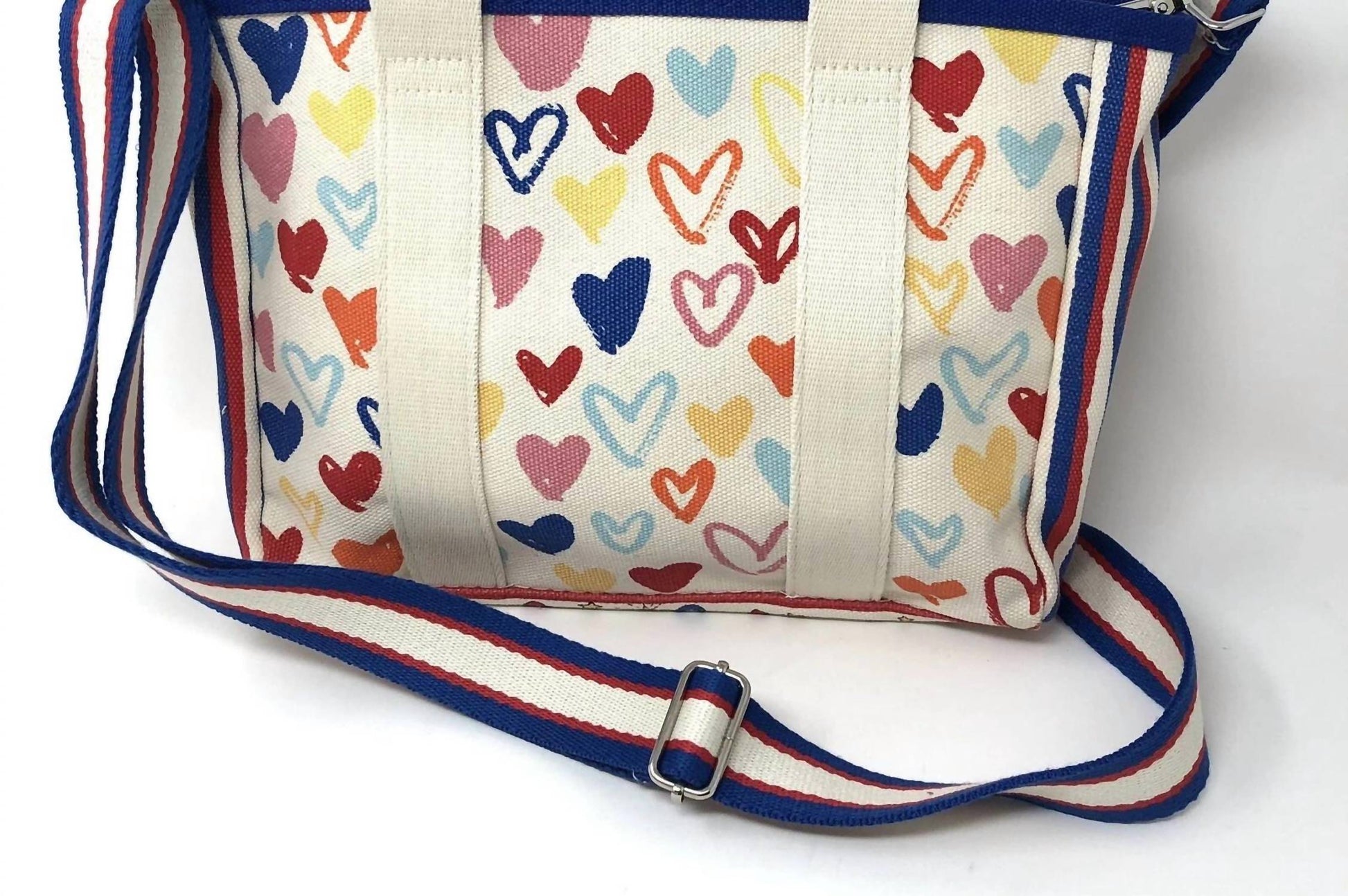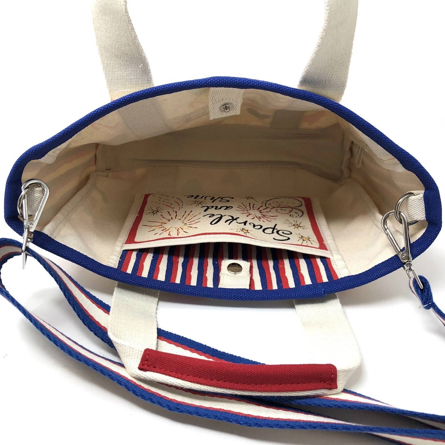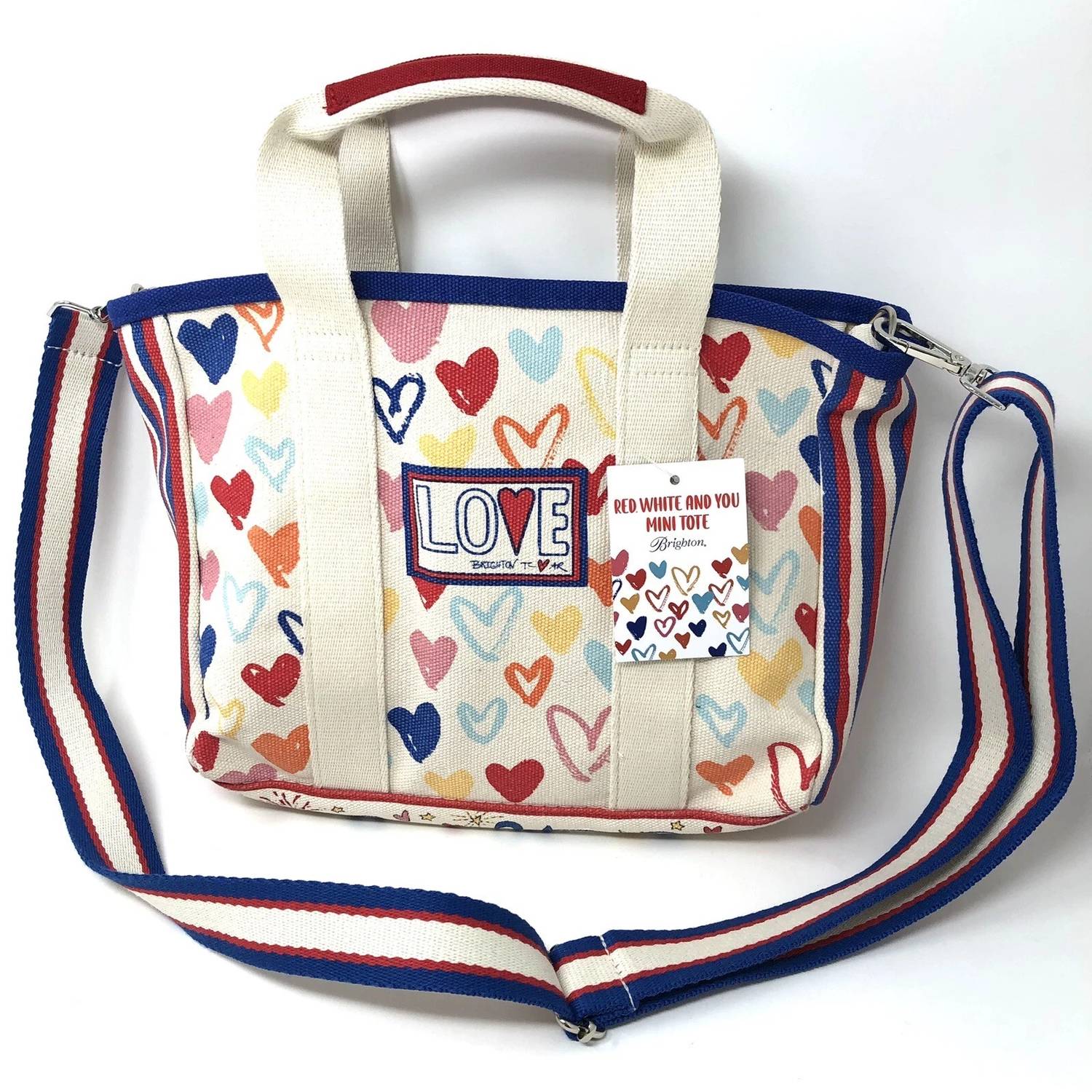 The perfect throw-it-in-and-go bag for your next weekend away or beach vacation! Its classic design will never go out of style and you'll be reaching for this bag season after season. Meet the Women's Mini You Canvas Tote Bag by Brighton, a perfect companion for summer adventures. Made from durable canvas, this tote showcases playful artwork by designers Tom Clancy and Aasha Ramdeen. Its dimensions are designed for convenience, with a height of 9 inches, a depth of 3 inches, and a width of 10.5 inches. The red and white color combination and the practical crossbody strap make it an essential, hands-free option for your day-to-day activities.