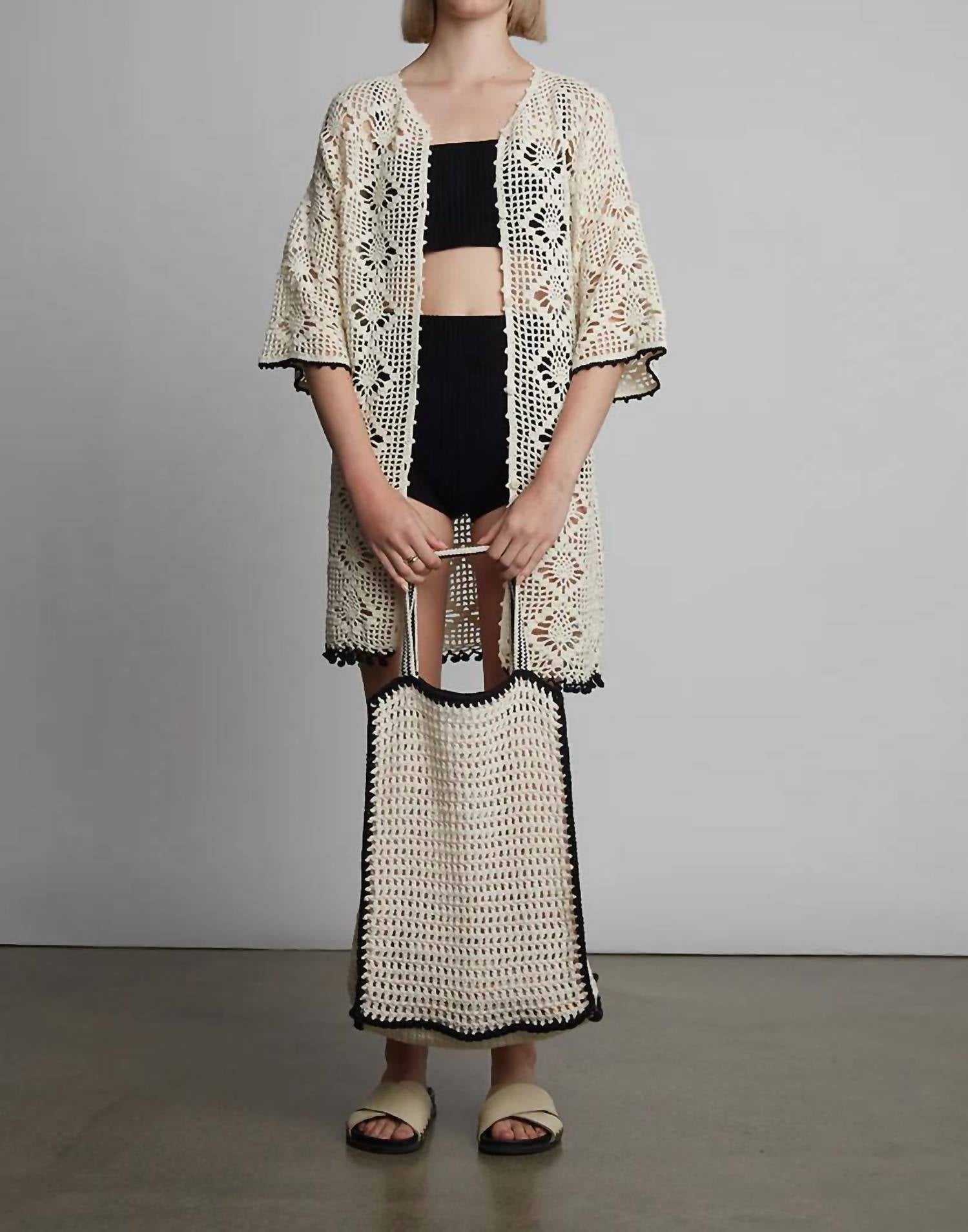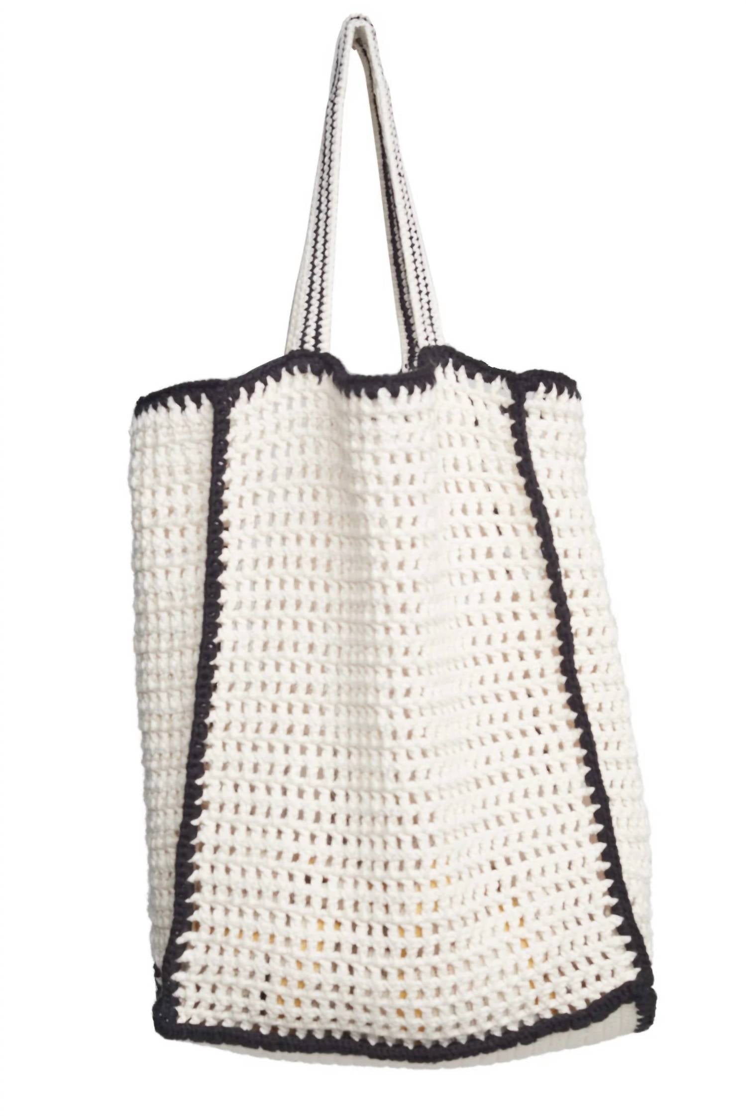 The perfect throw-it-in-and-go bag for your next weekend away or beach vacation! Its classic design will never go out of style and you'll be reaching for this bag season after season. Introducing the Women's Vera Crochet Tote Bag by ELEVEN SIX, a must-have accessory for sun-soaked adventures. Crafted from 100% Peruvian cotton, this sustainably made tote boasts an eye-catching modern crochet mesh-stitch design, enhanced by contrast-black crochet framing. Its two-tone tick-stripe handle provides both style and durability. Care instructions include dry cleaning, hand-washing in cool water, and drying flat; do not tumble dry.