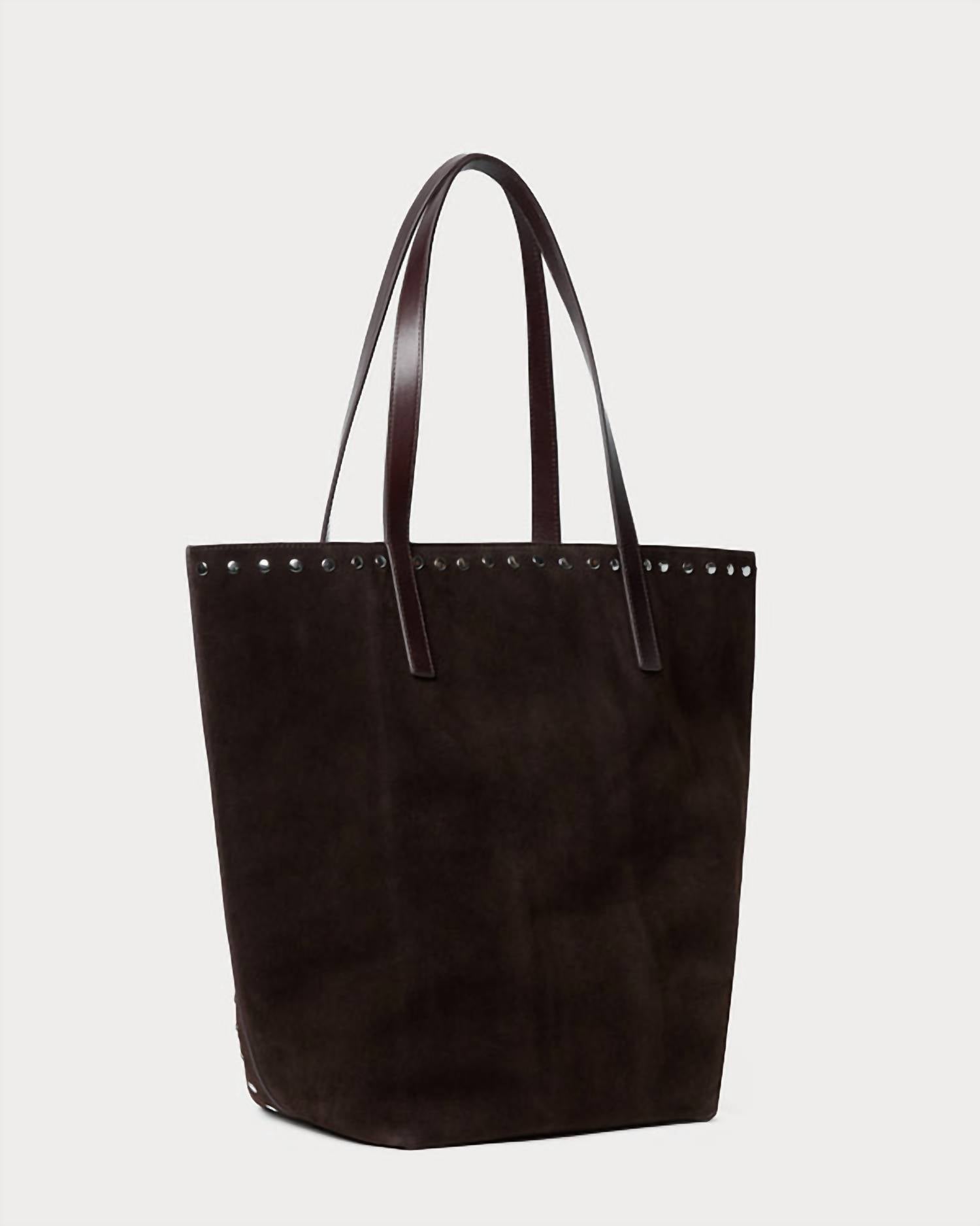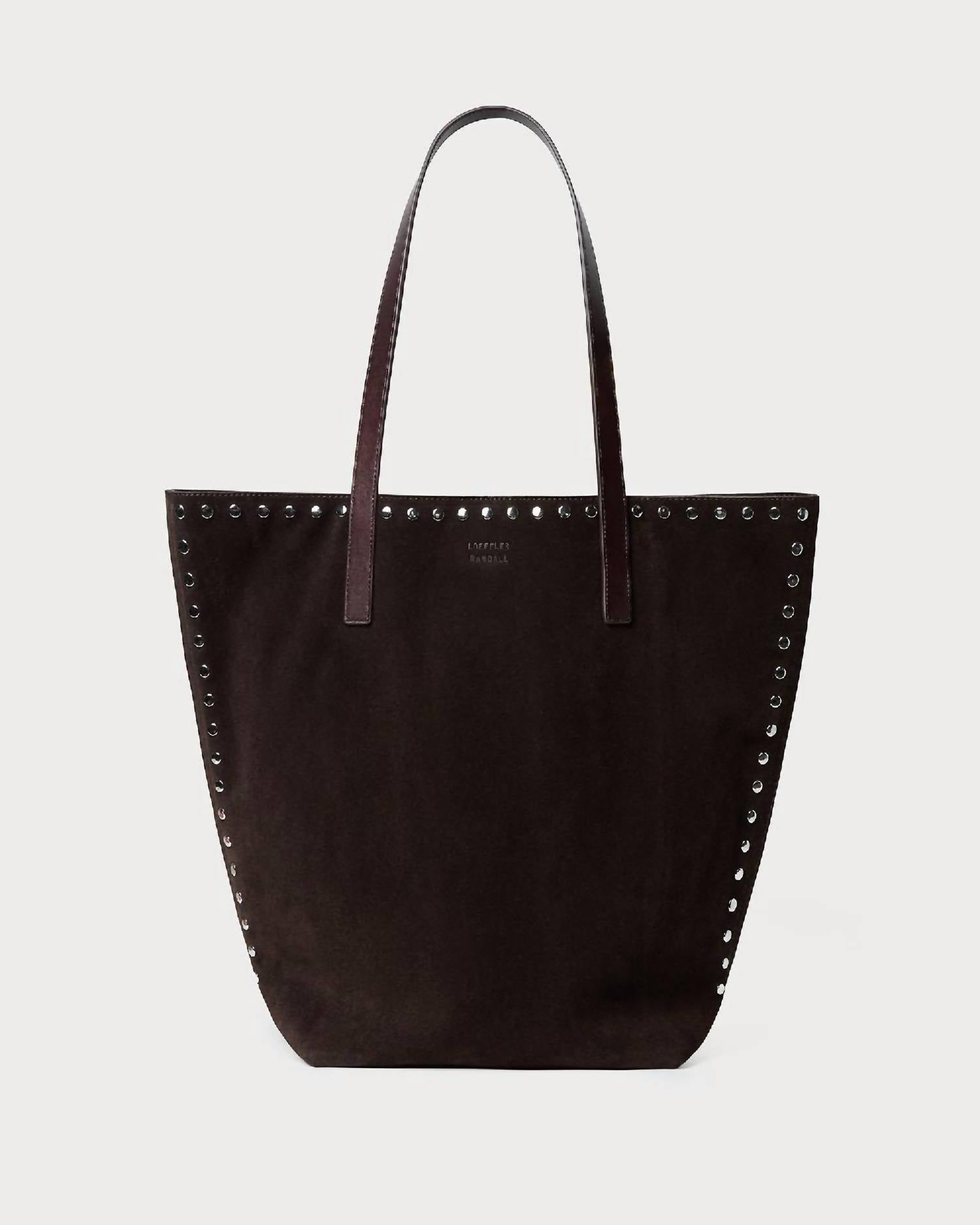 Aside from being the cutest bag ever, this tote is the perfect size to hold all of your vacation necessities. Pair this adorable bag with a flowing dress and some slides and you're all set! Introducing the Women's Walker Tote Bag by Loeffler Randall, a timeless essential crafted for everyday sophistication. This tote, made from rich brown 100% Bovine leather suede, features sleek silver-tone stud detailing along the edges for a refined touch. Its magnetic snap closure offers easy access to essentials, with a hanging interior pocket for added functionality. Designed with practicality in mind, the bag measures 16" W x 7.4" D x 14.5" H and provides a convenient strap drop of approximately 9".