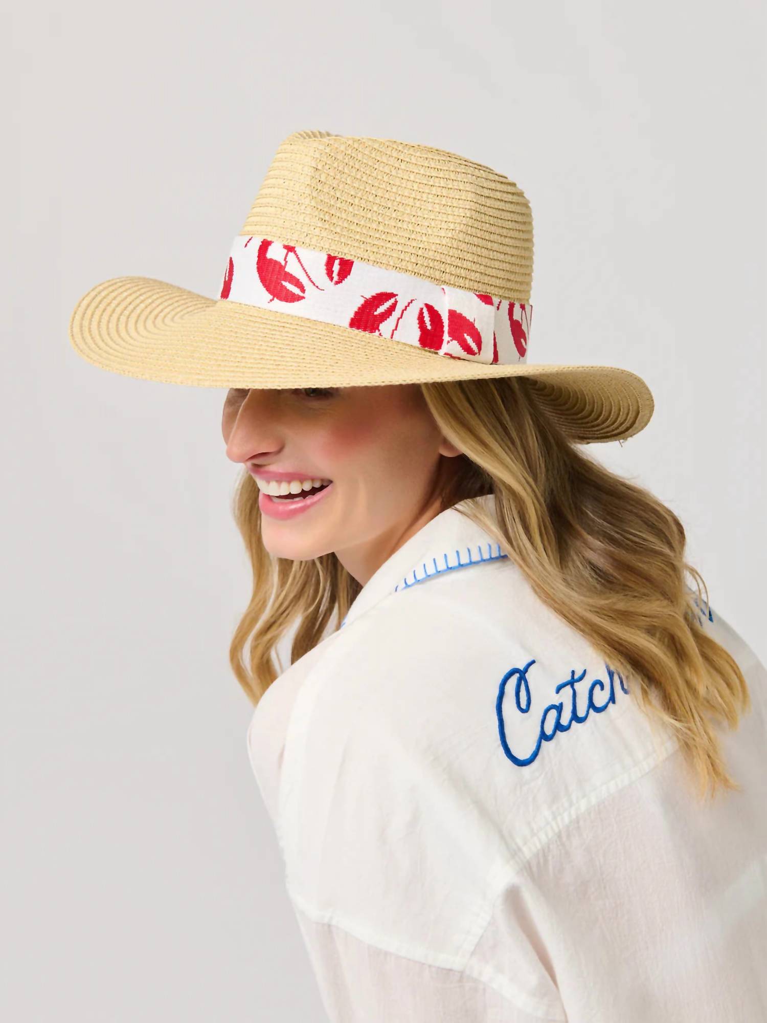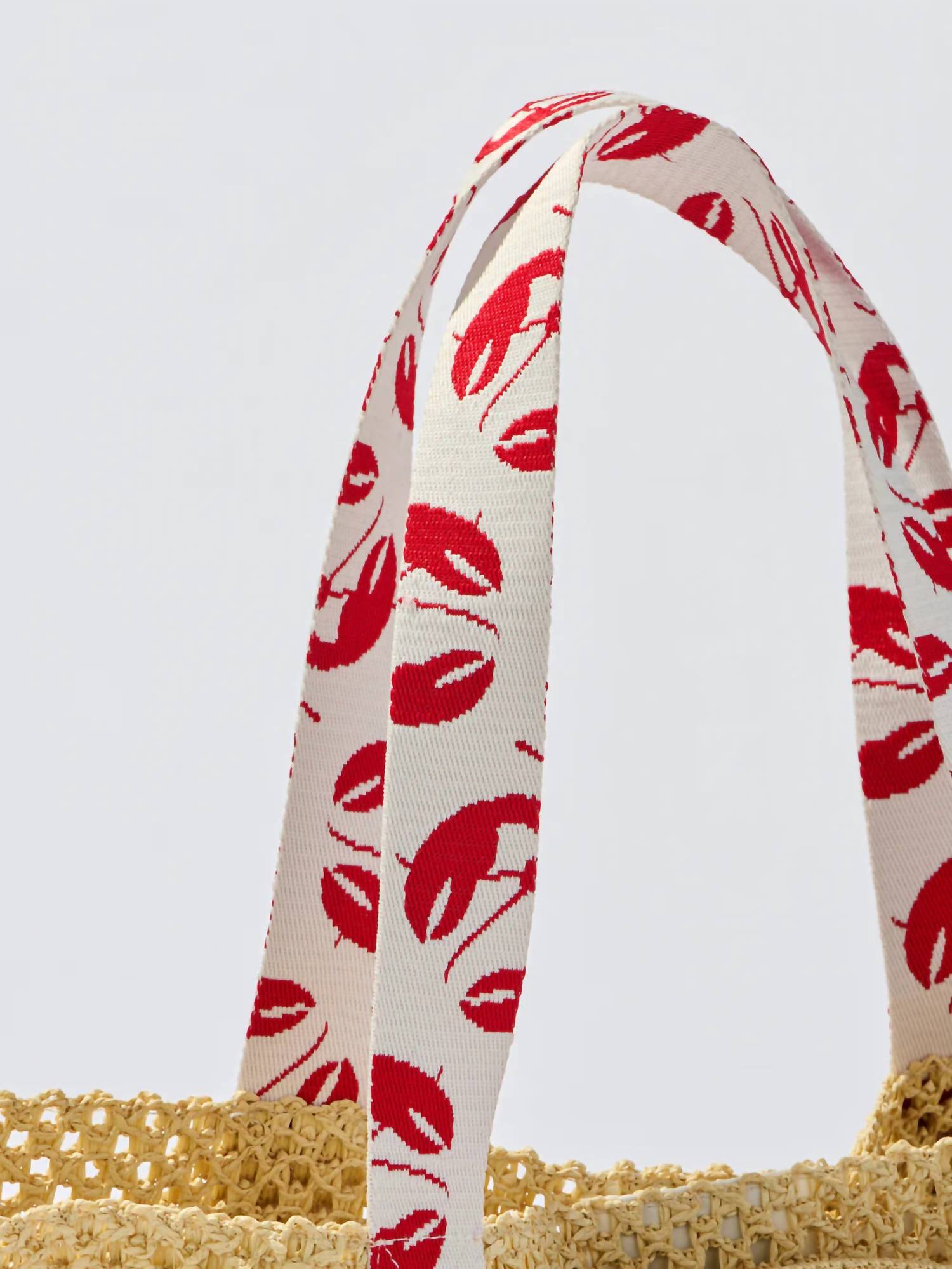 The perfect throw-it-in-and-go bag for your next weekend away or beach vacation! Its classic design will never go out of style and you'll be reaching for this bag season after season. Embrace playful coastal charm with the Claudia Tote and Hat Set by Shiraleah, a stunning pair in a bold red-and-white lobster print. Crafted from natural open-weave straw, this spacious tote measures 22" in width, 15" in height, and 6.5" in depth, perfect for summer adventures. The set includes a matching hat that conveniently fits into the exterior straps, ensuring you're always stylishly prepared. Secure essentials with the magnetic snap closure and keep smaller items organized in the interior slip pocket.