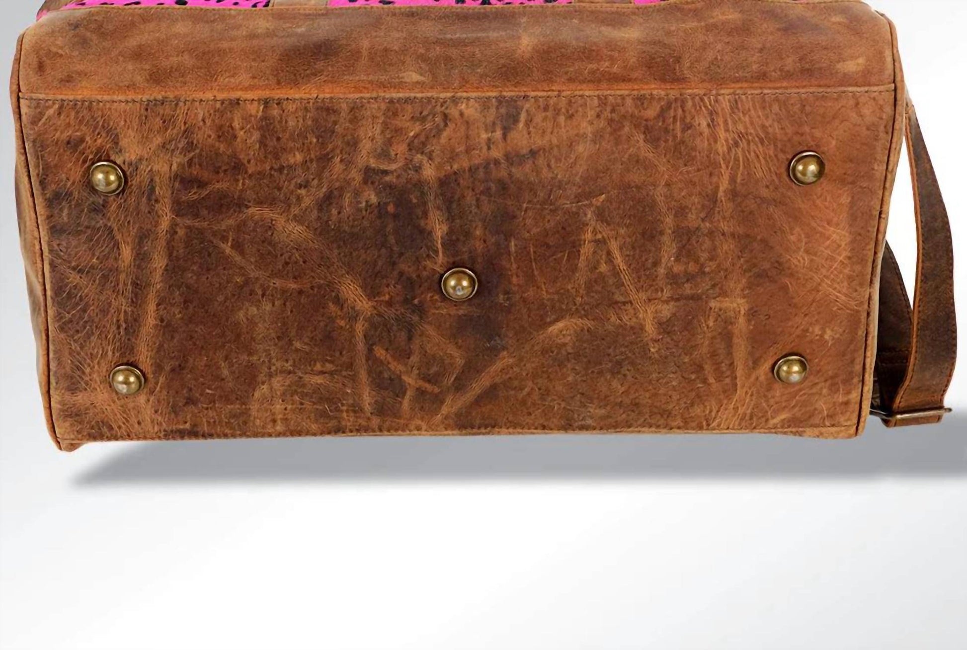 The travel bag you need for your next adventure. Perfect in size, this bag not only holds everything you need, but its stand-out style will be having you want to book your next vacation. The Women's Leather Duffel Bag by American Darling combines high-quality full grain leather for a luxurious feel and durability. With its adjustable leather shoulder strap and solid antique finish metal fittings, this multi-color travel bag exudes a refined western aesthetic. Secure your essentials with the genuine YKK zipper closures, renowned for their long-lasting reliability. Expertly crafted in Texas, this eco-friendly handbag marries western culture with a modern touch, measuring 12 inches high, 21 inches wide, and 11.5 inches deep.
