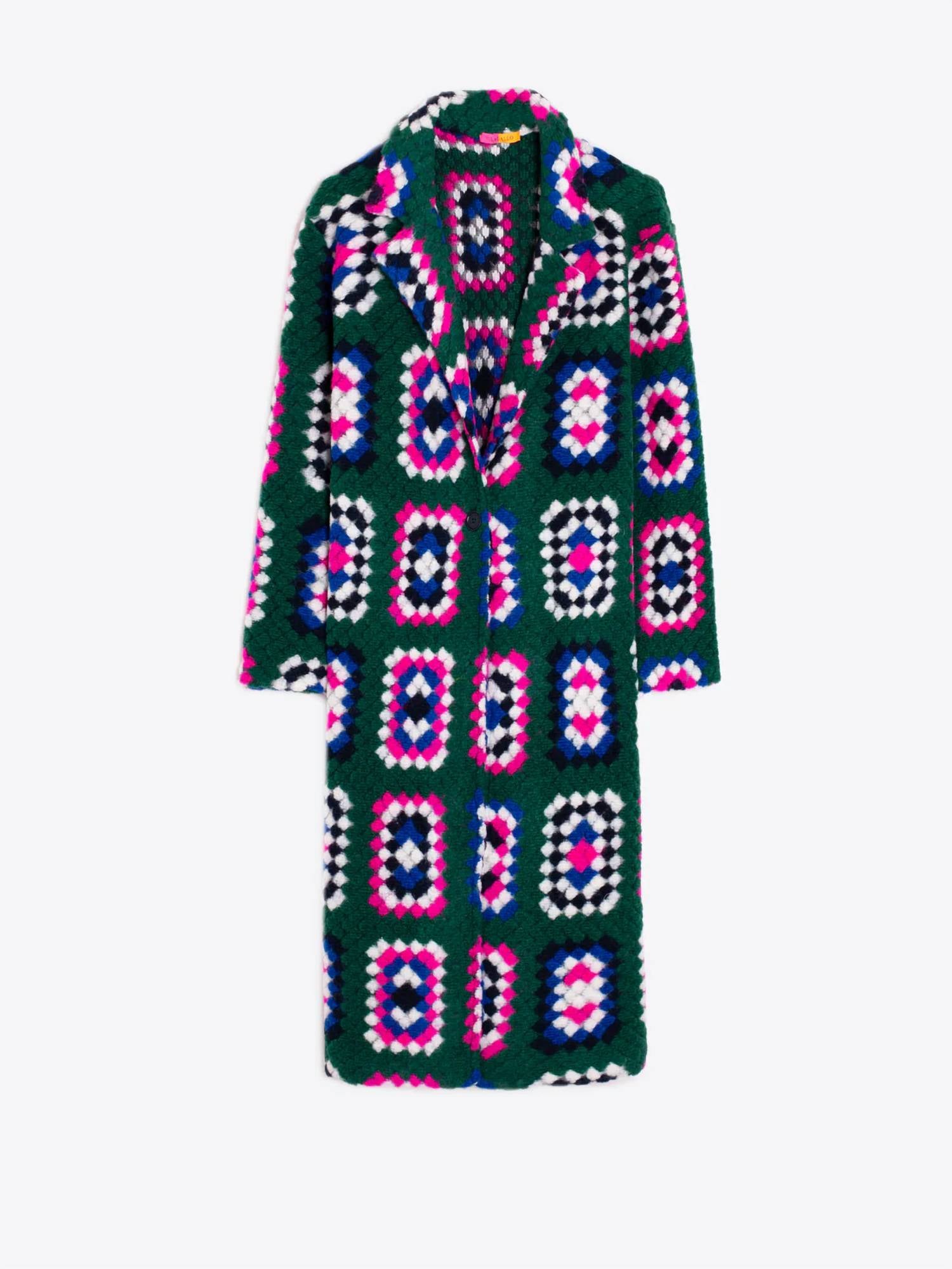 A timeless classic. You'll be reaching for this trench every season. Embodiment of bold and elevated style in a striking Crochet Verde hue. Featuring long sleeves and a notched lapel. Expertly crocheted in Portugal to a midi length, providing a cozy yet sophisticated silhouette. Button front closure adds a classic touch, making it perfect for pairing with a sleek shift dress and boots. Care for this stylish piece with a hand wash; its patterned elegance will complement your winter workwear collection beautifully.