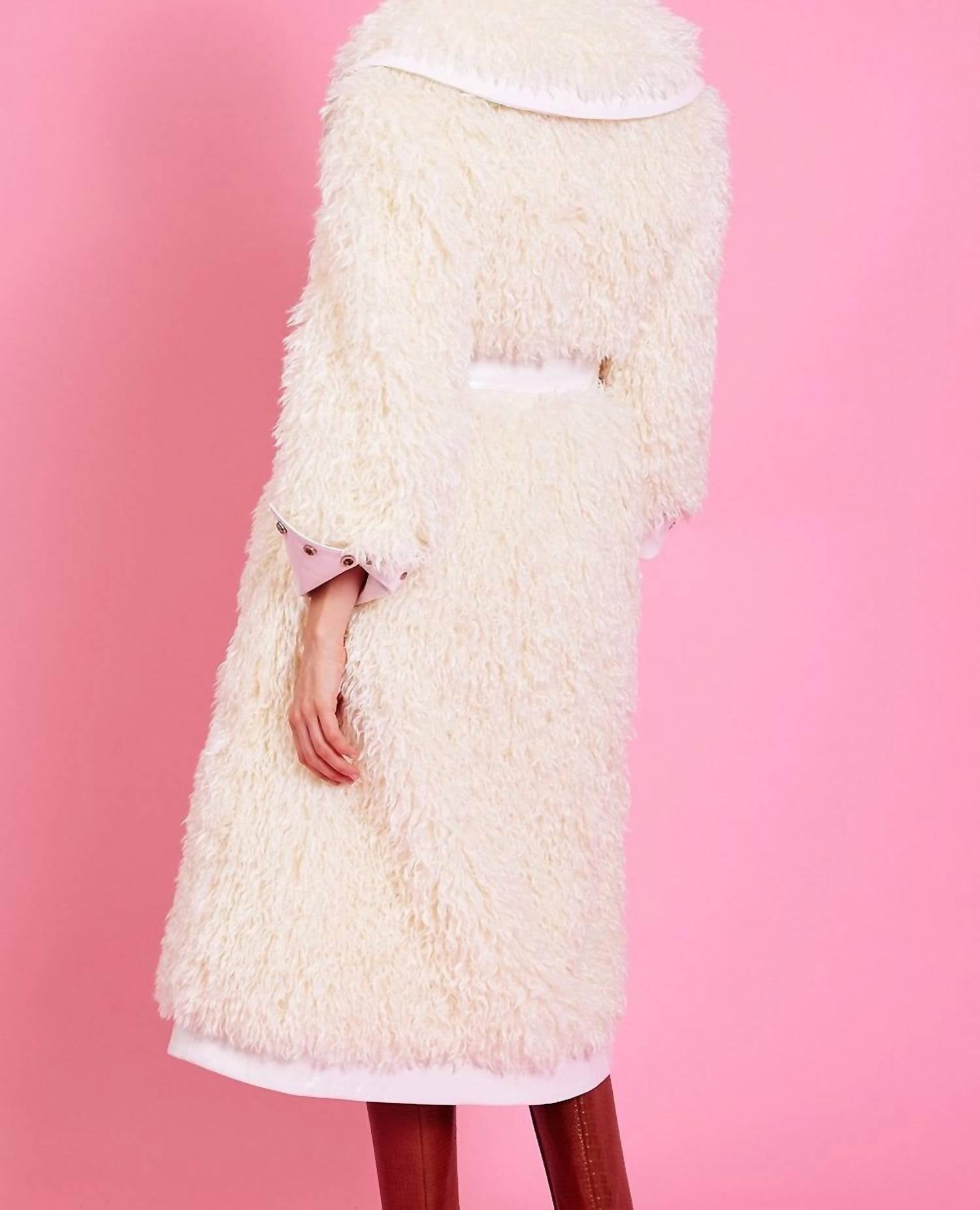 Classicly chic, this is the kind of trench coat that never goes out of style. Introducing the Knitted Faux Shearling Coat by JAYLEY, a textured masterpiece designed for ultimate elegance in white. This women's trench coat features long sleeves with exquisite hand-knitted bamboo construction, complemented by luxurious faux leather cuff and panel details. Composed of 15% Tencel, 29% Bamboo, and 56% Modacrylic, it boasts a super soft faux Mongolian fur finish that cascades into a striking maxi length silhouette. Adorned with practical side pockets, a belted closure, and a fully lined interior, this coat is a statement of warmth and sophistication for any occasion.