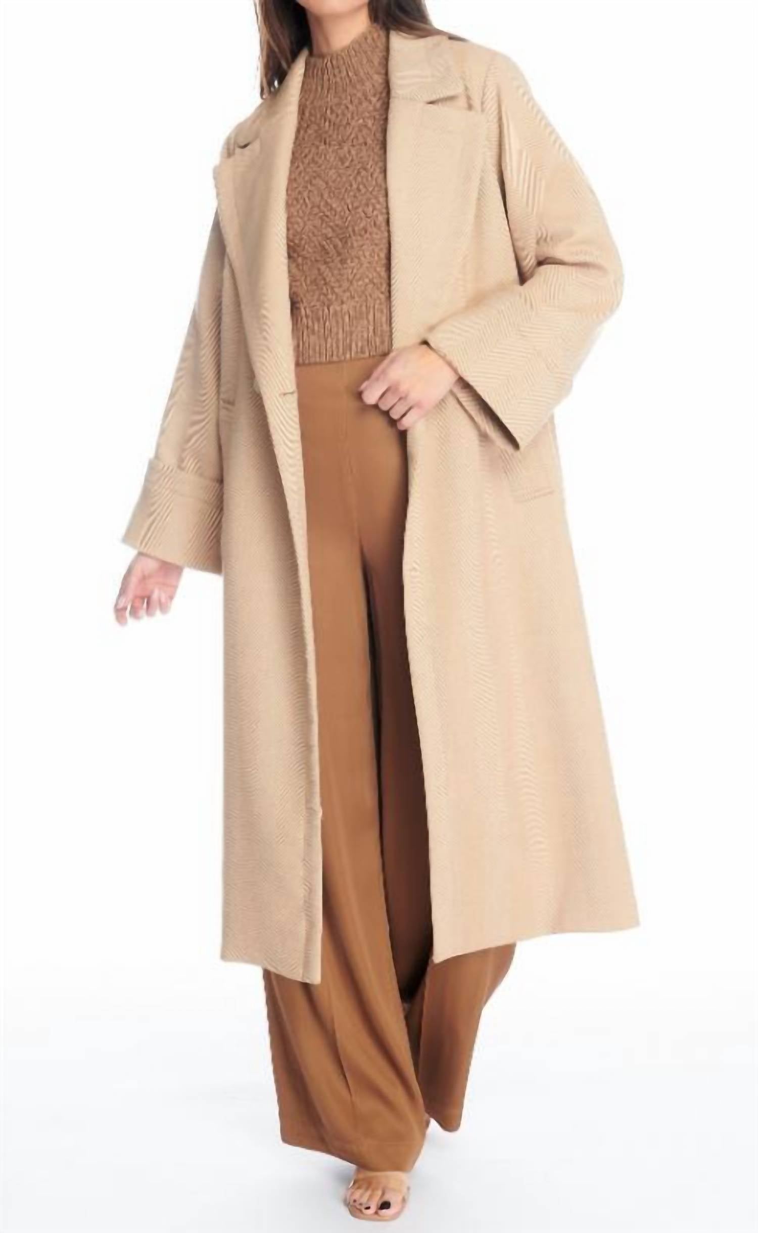 This trench coat, expertly tailored from a wool blend, features long sleeves and a chic collar for a sophisticated silhouette. Designed for women, it includes practical pockets and a button closure, making it a perfect choice for the cooler months. This unlined piece is easy to care for with hand washing instructions.