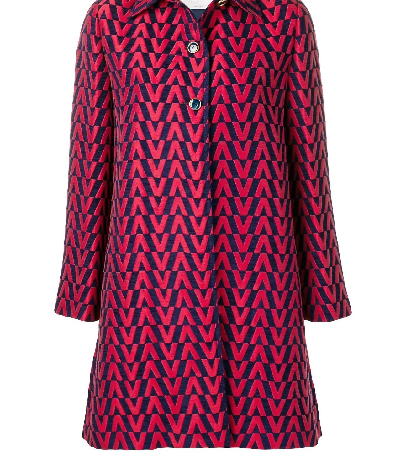 A timeless classic. You'll be reaching for this trench every season. Elevate your winter wardrobe with the Single Breasted Brocade Coat by Valentino, a sophisticated trench in a striking blue and red graphic design. Crafted from a luxurious blend with 56% Acrylic, 34% Linen/Flax, and 10% Polyamide, it features long sleeves and a pointed, close-fitting collar for a refined silhouette. Designed and made in Italy, this coat is lined with 100% silk and includes a button front closure and two convenient side pockets. Care instructions recommend dry cleaning to maintain its exquisite quality.
