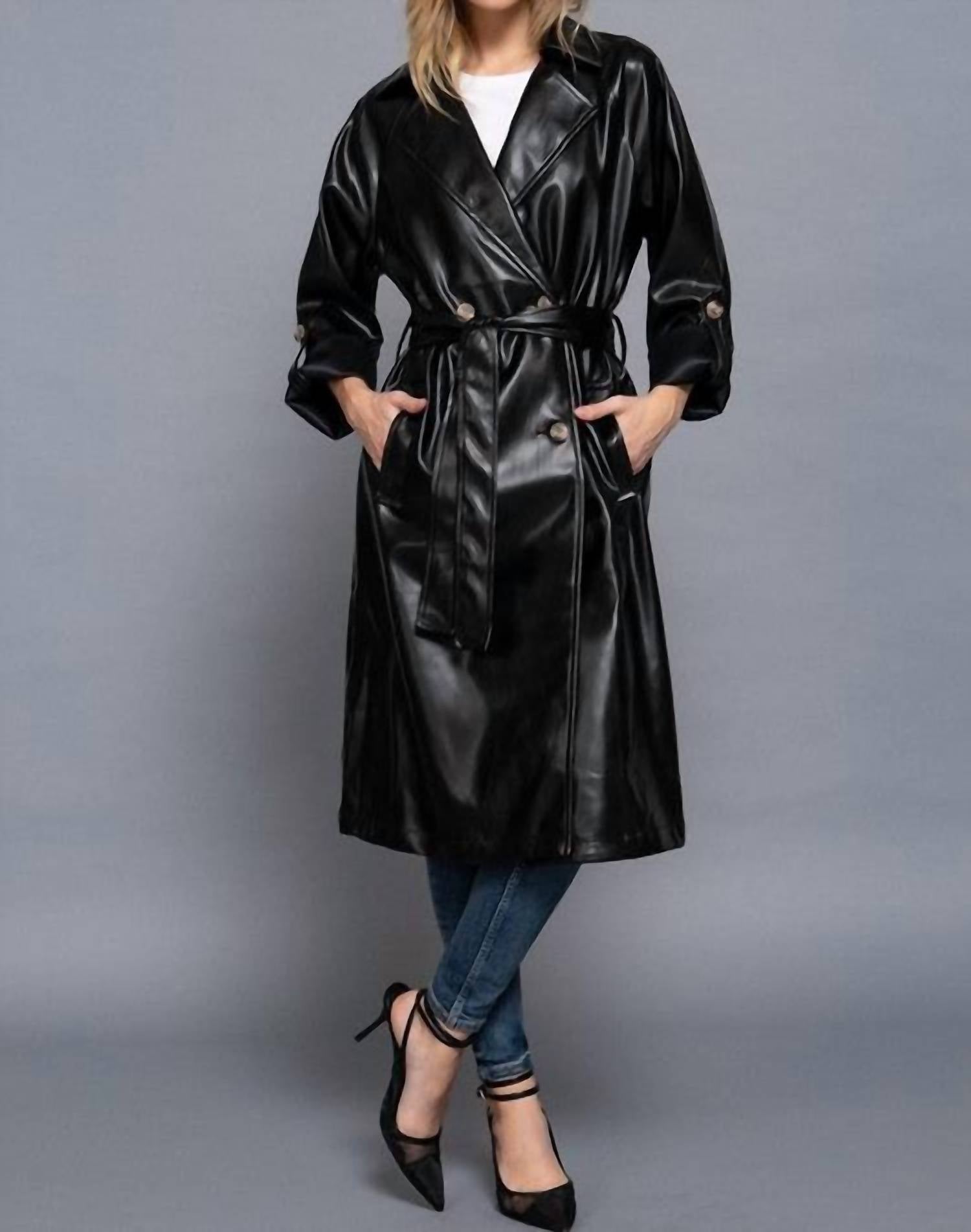Active Usa - Double Breasted Faux Leather Trench Coat