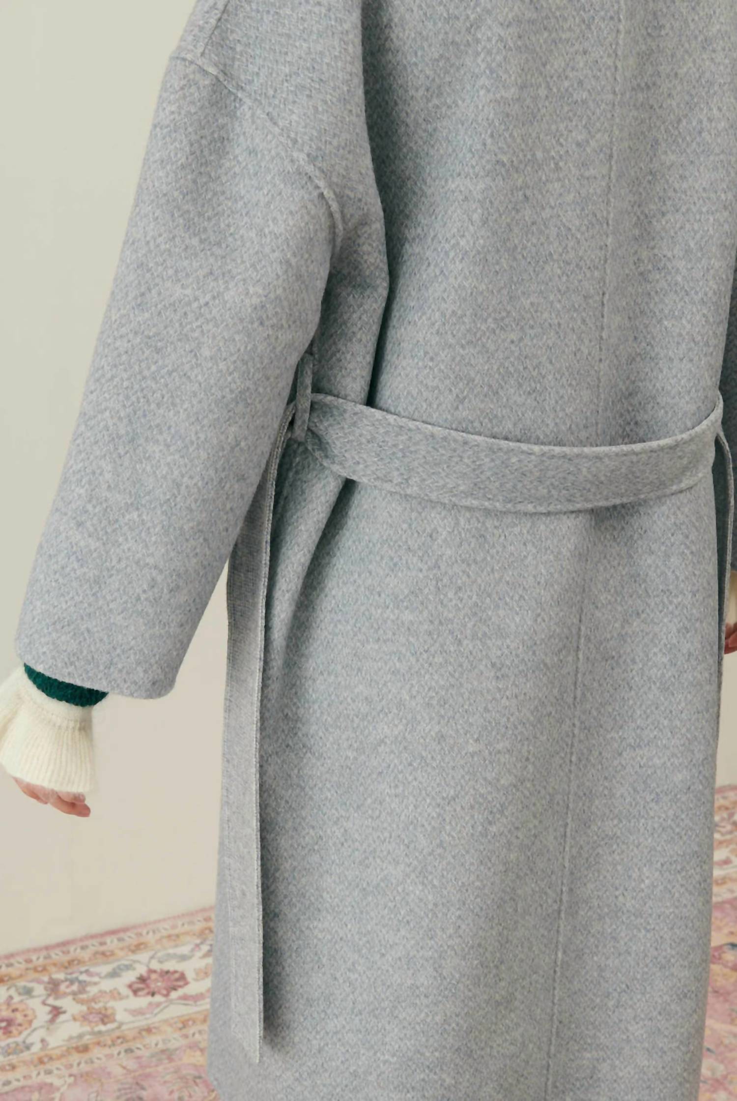 A timeless classic. You'll be reaching for this trench every season. The Sullyne Coat by Louise Misha, available in Blue Mini Checks, is an elegant and functional addition to your winter wardrobe. Crafted with long sleeves in a 50% wool, 50% polyamide blend, this coat features a unique reversible design with small checks on one side and chevron on the other, complemented by welt and patch pockets. Designed with a self-tie belt closure and a 100% cotton lining, it offers comfort and style with a classic collar and lapels. Care: Dry clean only. Model wears a size S.