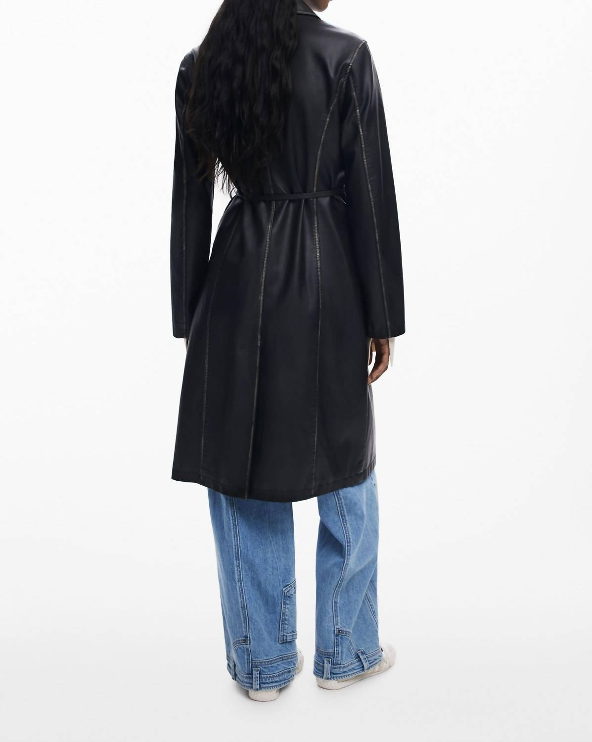 A timeless classic. You'll be reaching for this trench every season. Meet the Vegan Trench Coat by Desigual, a chic addition to your wardrobe with its stylish long sleeves and elegant button closure. Crafted from 100% polyurethane with a 100% polyester inner fabric, this trench coat features a unique worn leather effect. It is designed with large front pockets and a removable adjustable drawstring at the waist for a customizable fit. The coat should not be washed, maintaining its standout appearance in solid black for a sophisticated look.