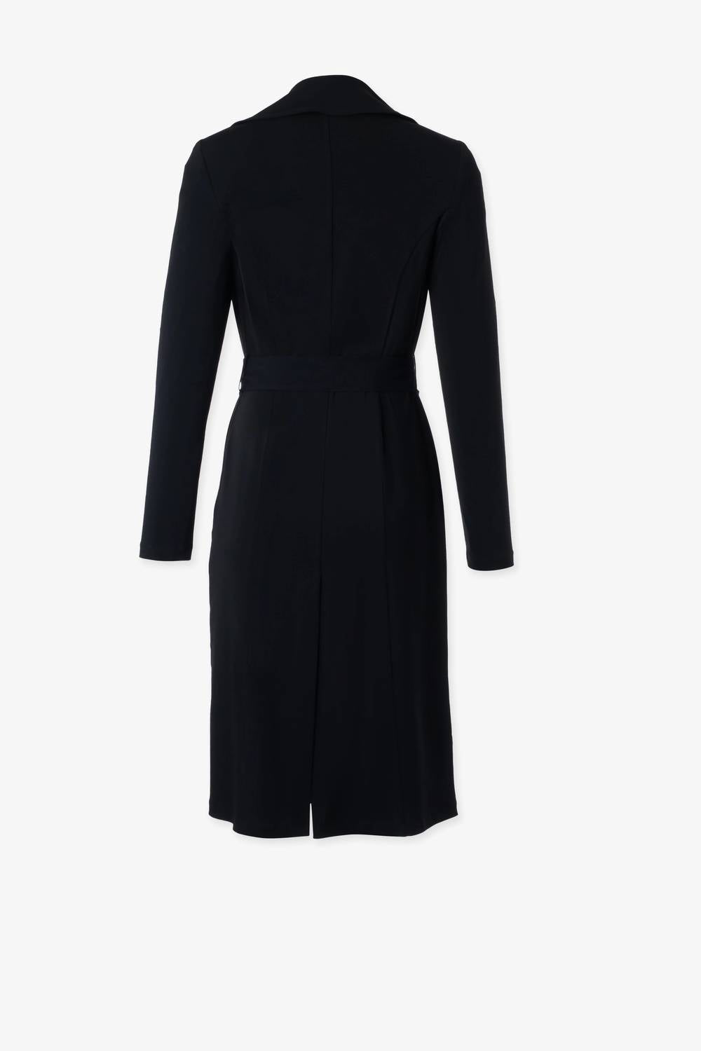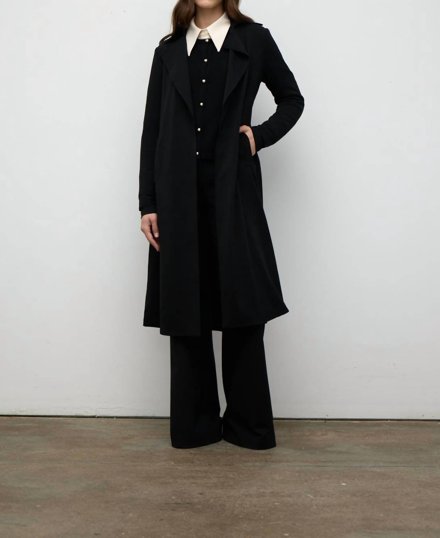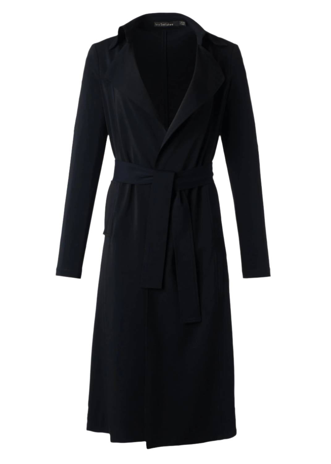 Elevate your outerwear with the Iris Setlakwe Matte Jersey Trench Coat in solid black, an ideal choice for travel and Thanksgiving occasions. With its short sleeves and collar neckline, this trench coat offers a timeless silhouette enhanced by a modern twist, complete with pockets for practicality. Composition: 76% Acrylic, 20% Polyamide, 4% Elastane. Proudly made in Canada, it features a belted design for a perfect fit. Care: Dry clean for best results.