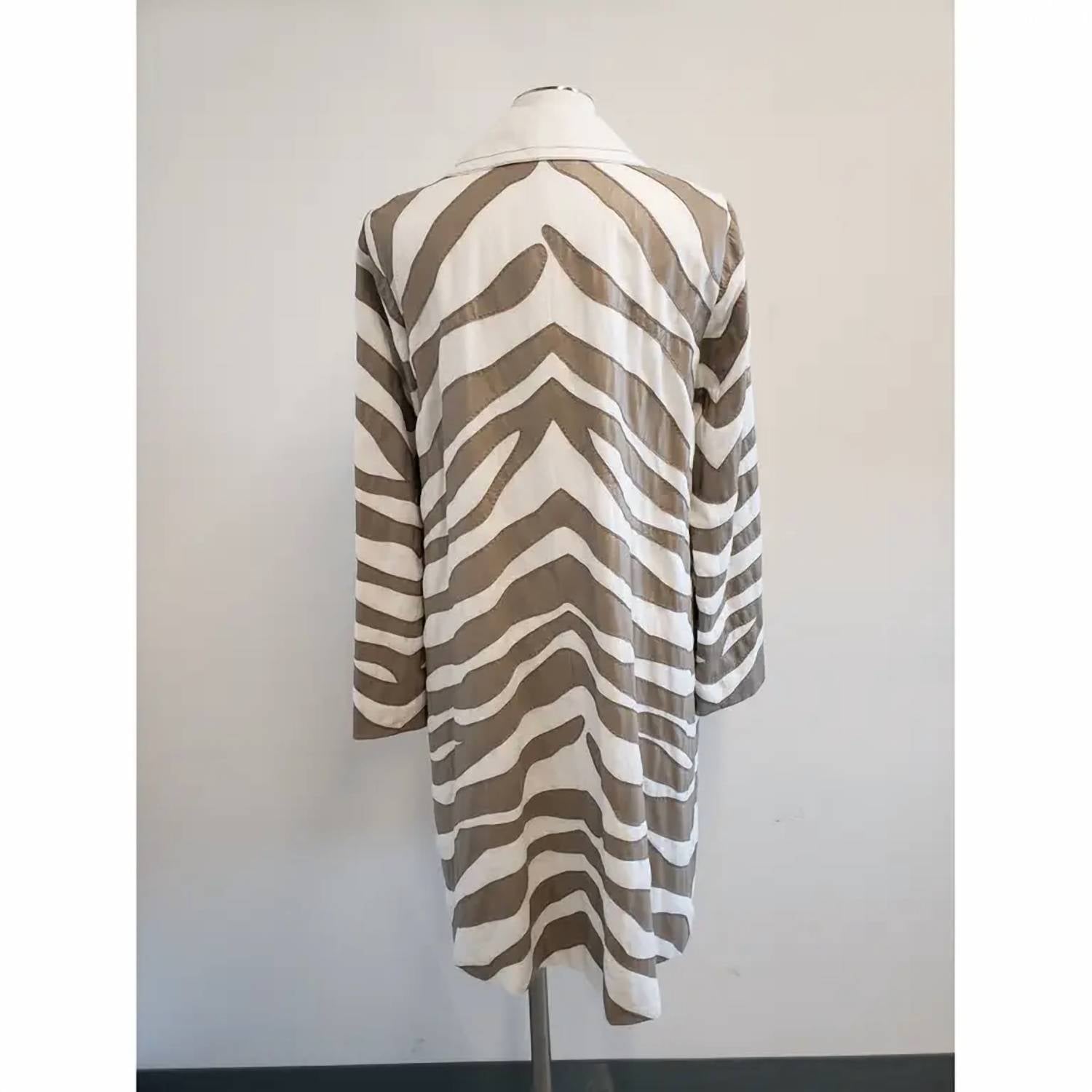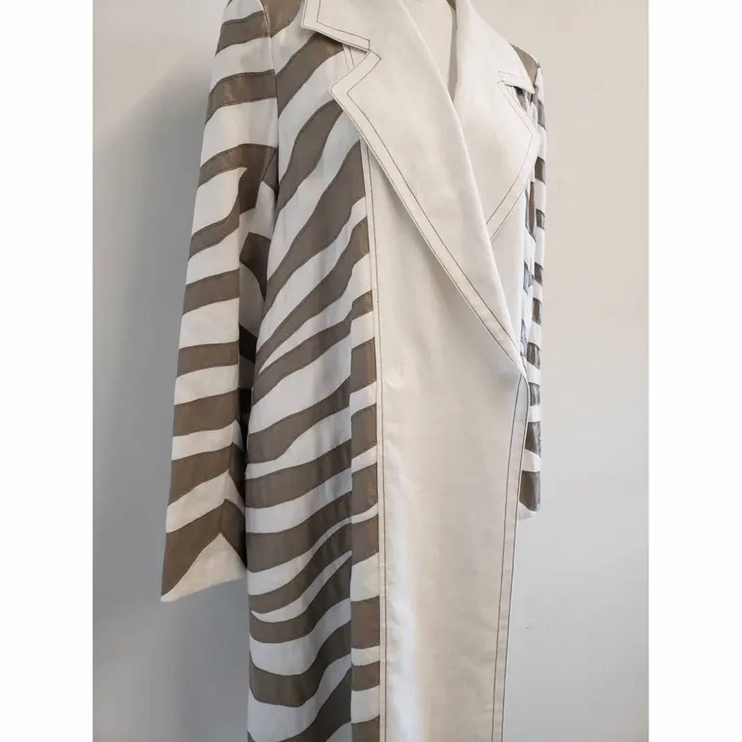 A timeless classic. You'll be reaching for this trench every season. This brand-new, 100% authentic coat makes a bold statement with its striking zebra print and refined leather detailing. Crafted with long sleeves and button cuff tabs, it features a classic button-front closure for a structured, polished look. Multi-line topstitching adds depth and craftsmanship to the design, while the leather accents elevate its modern edge. A standout piece that blends artistic flair with timeless sophistication.
