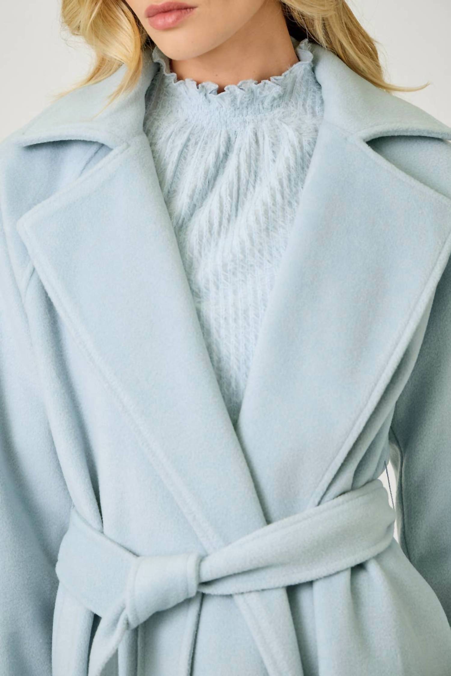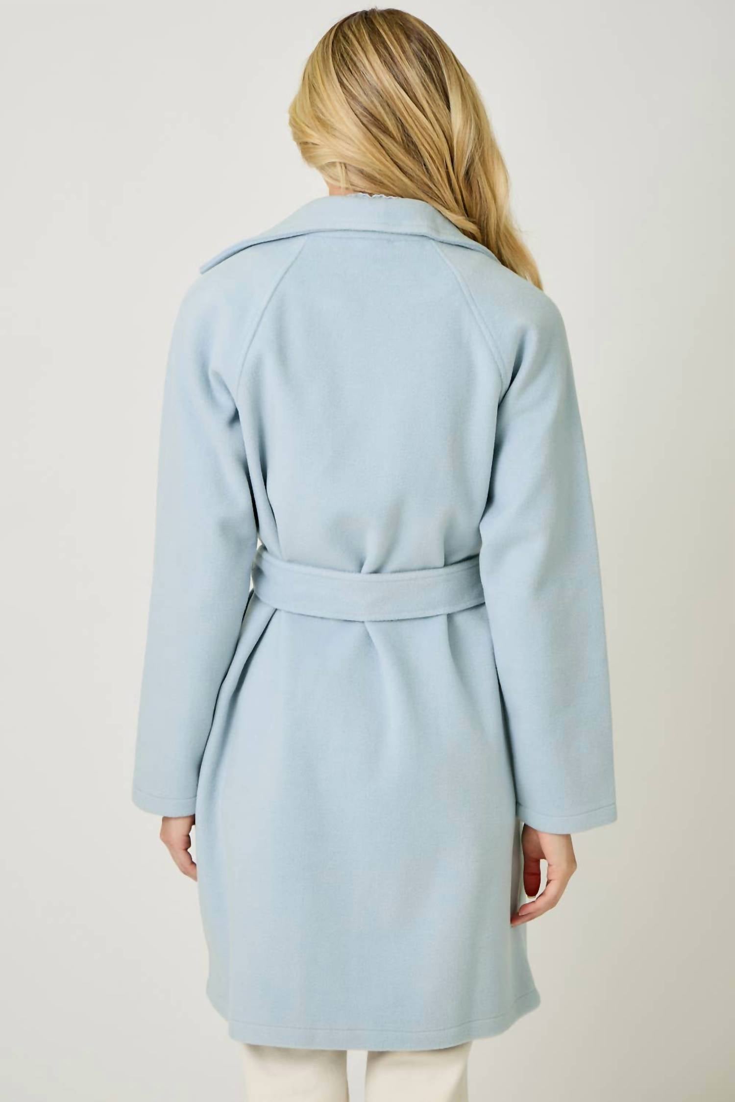 A timeless classic. You'll be reaching for this trench every season. Embrace minimalist sophistication with the Lapel Collar Robe Coat by Mystree, perfect for New Year's Eve or dinner parties. Designed for versatility with long sleeves and a knee-length silhouette in Blue Breeze, this solid coat is crafted from 100% Polyester. The lining adds comfort, while practical side pockets and a tie closure elevate functionality for everyday wear. Care: Machine wash.