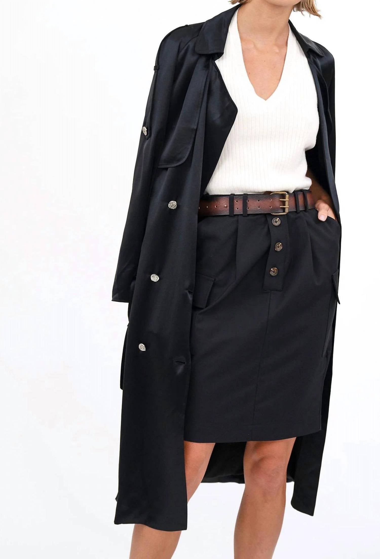 The perfect trench coat that you can throw over any outfit. The Violet Trench Coat by Nonchalant Label is a chic addition to any fall wardrobe, designed to transition effortlessly between occasions. This minimalist black trench features long sleeves and a button closure for a sleek and polished look. Crafted from luxurious polyester, it is perfect for layering without the bulk, while the solid pattern with silver hardware enhances its elegant appeal. Care: Dry clean only.