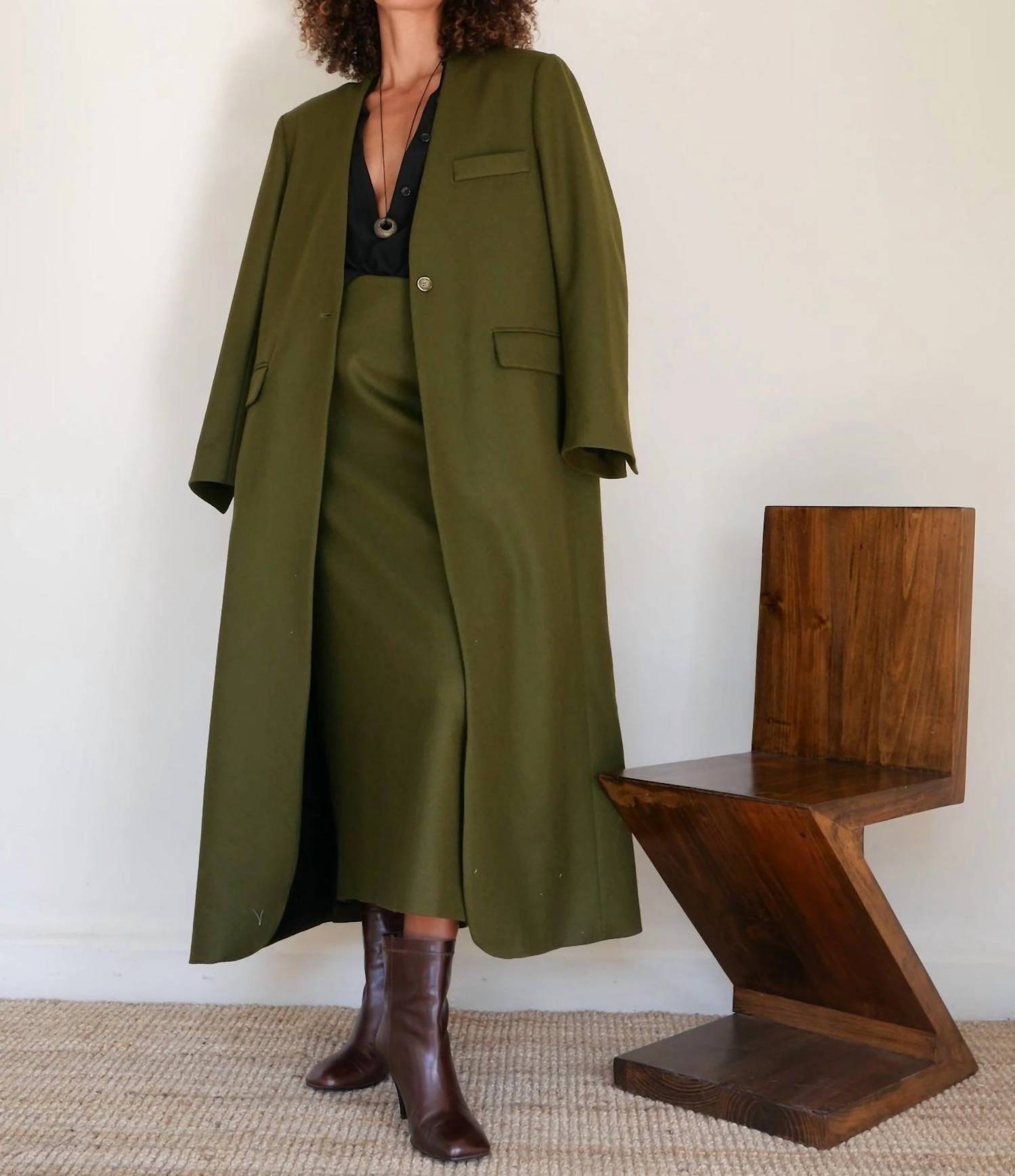 A timeless classic. You'll be reaching for this trench every season. Embrace elegance with the Sloan Long Collarless Coat, a sophisticated piece in a striking green shade. This minimalist trench coat presents an uninterrupted silhouette thanks to long sleeves and a single button closure, extending the lines of a blazer into outerwear. Crafted from 100% wool, it is fully lined and equipped with convenient pockets for practical luxury. Made in Mexico, this solid-patterned coat is perfect for winter travel and requires dry cleaning to maintain its refined appearance.