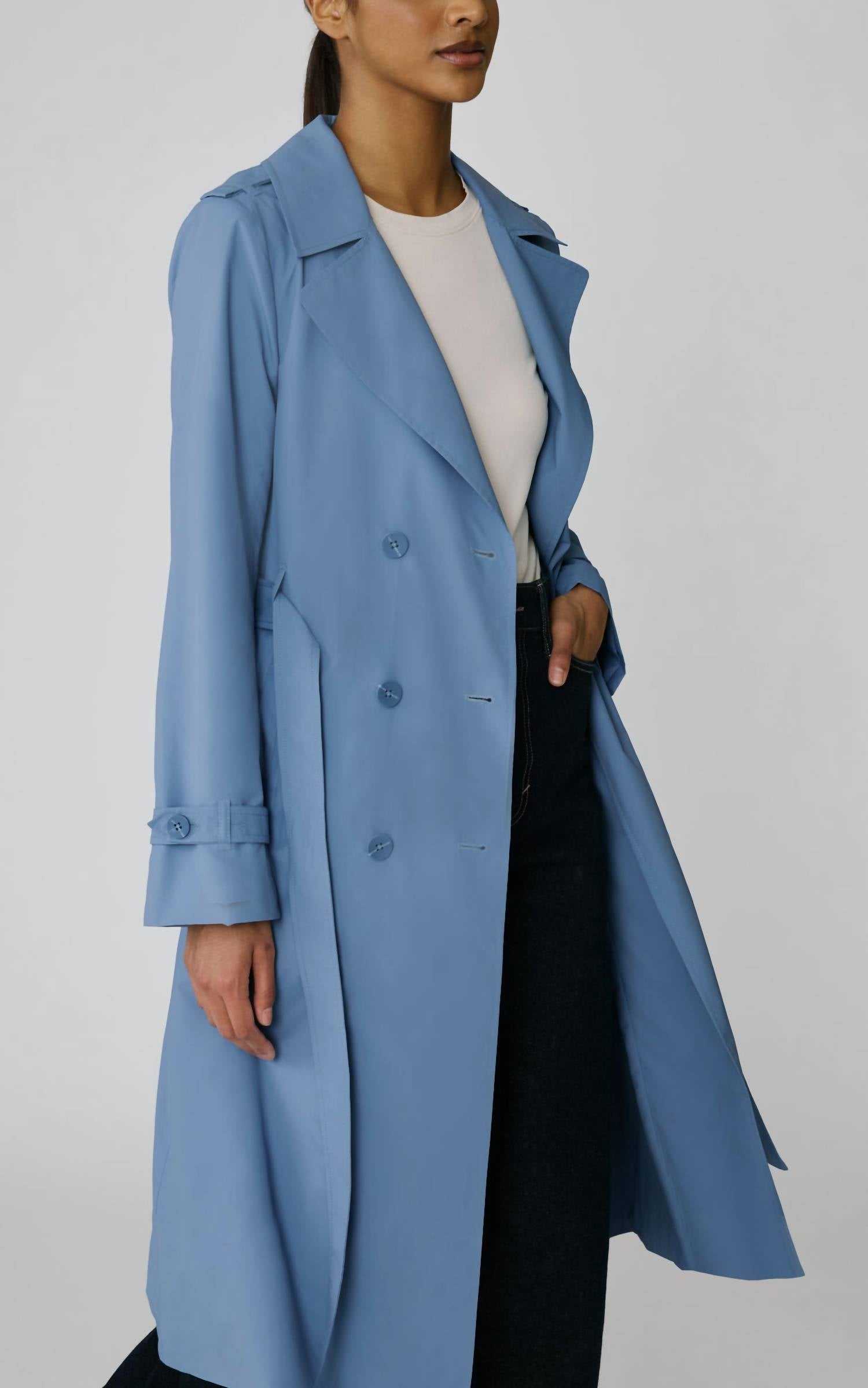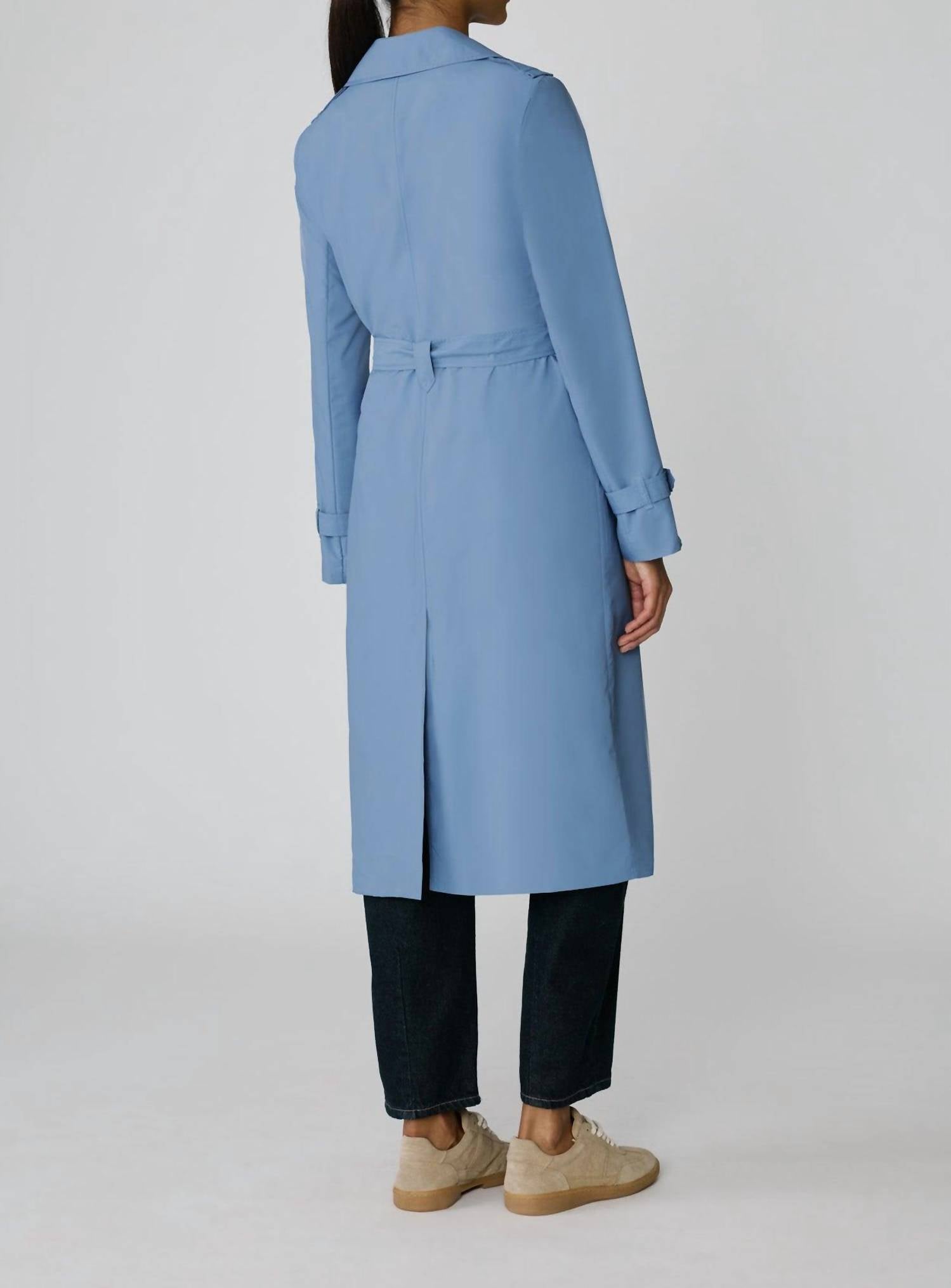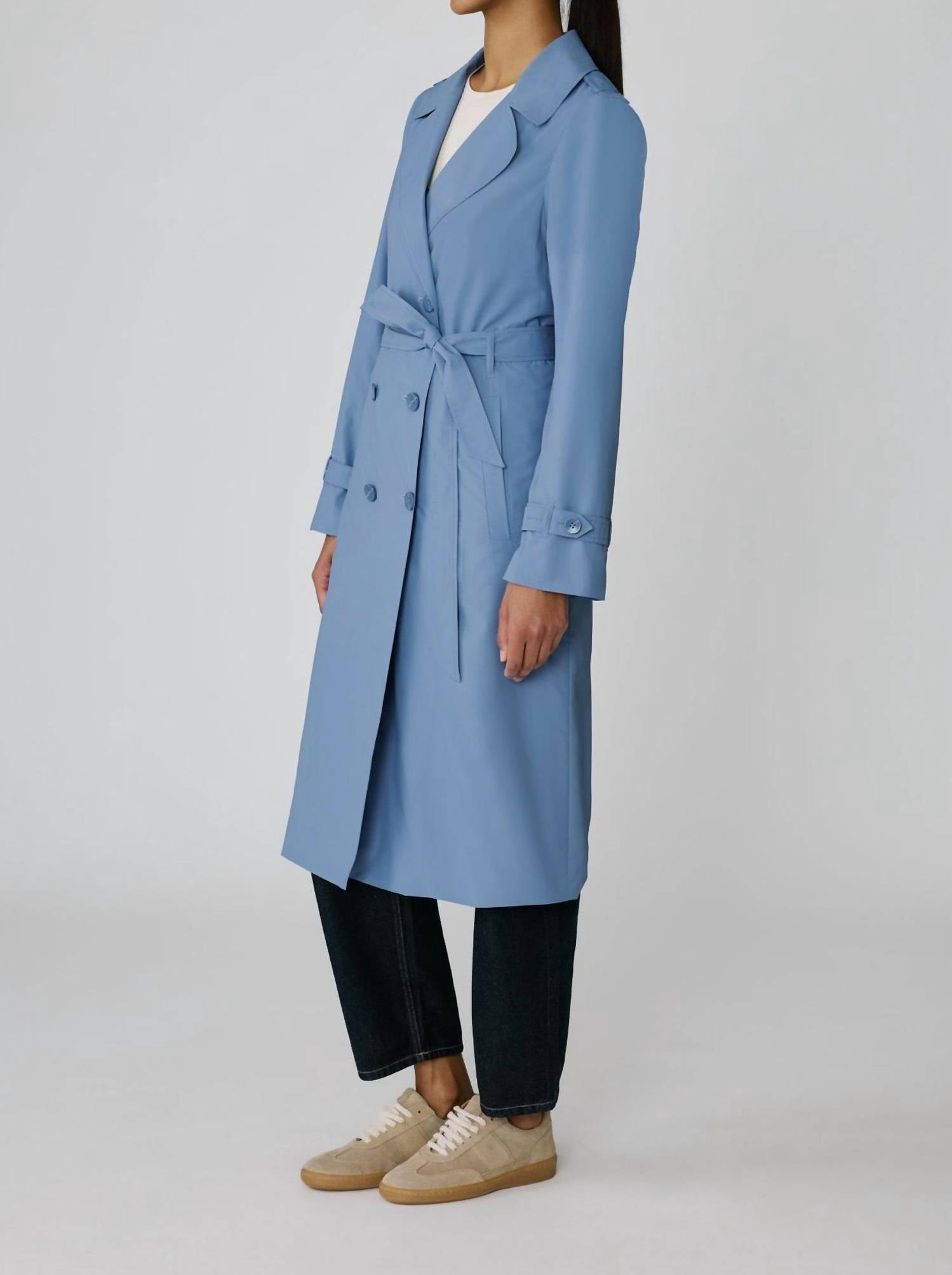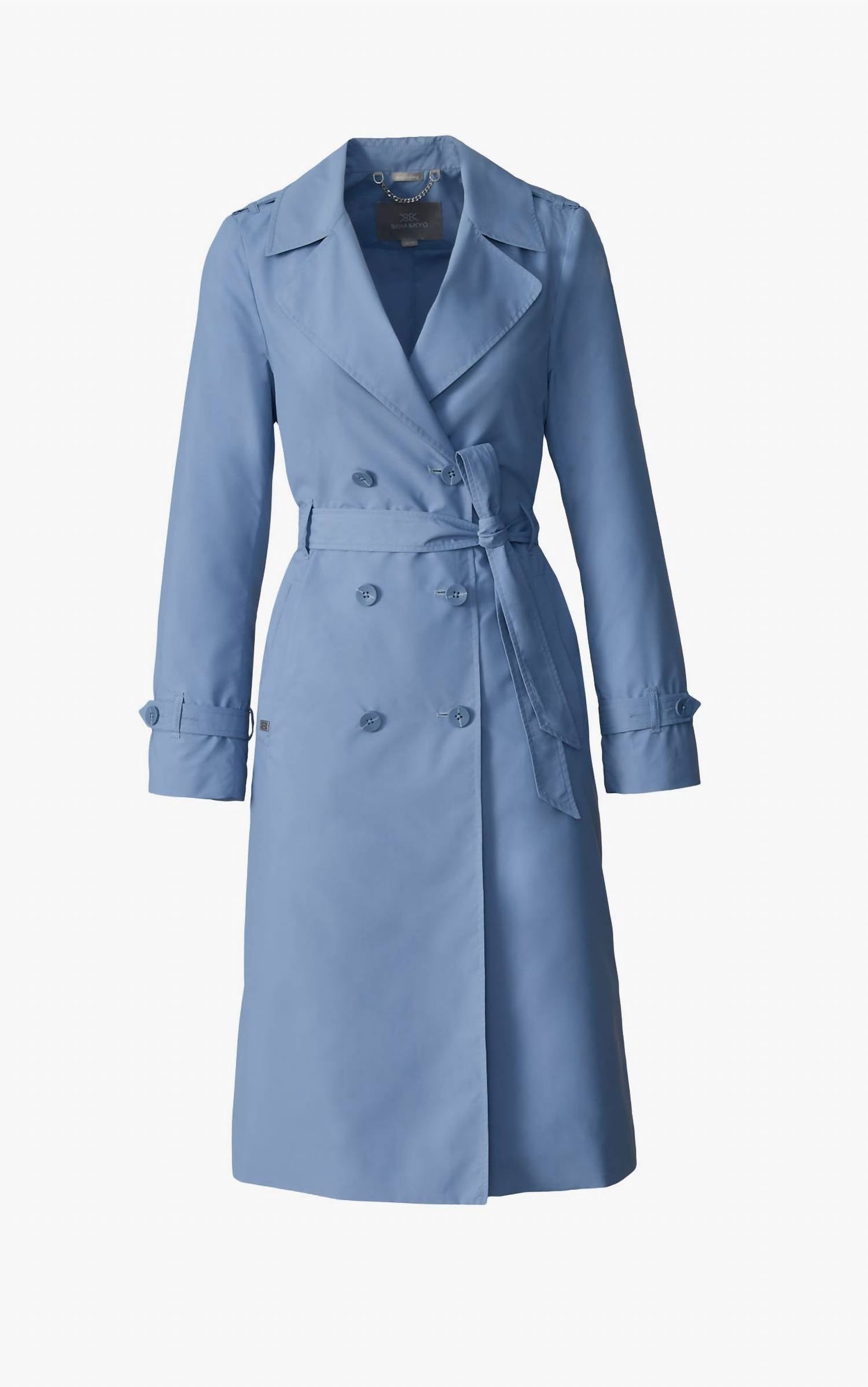 A timeless classic. You'll be reaching for this trench every season. Introducing the Blaire Double-breasted Trench Coat by SOIA & KYO, a chic wardrobe piece in a serene sky hue for transitional seasons. This trench coat features long sleeves and is crafted from 100% polyester, offering both a luxurious feel and a practical water-repellent finish. Designed to fall to a calf-length of 24 inches, it includes a classic double-breasted button closure and a detachable waist belt for added versatility. Care: Machine wash in cold water, iron on low heat, tumble dry on low heat. Model is 5'8" and wears size XS.