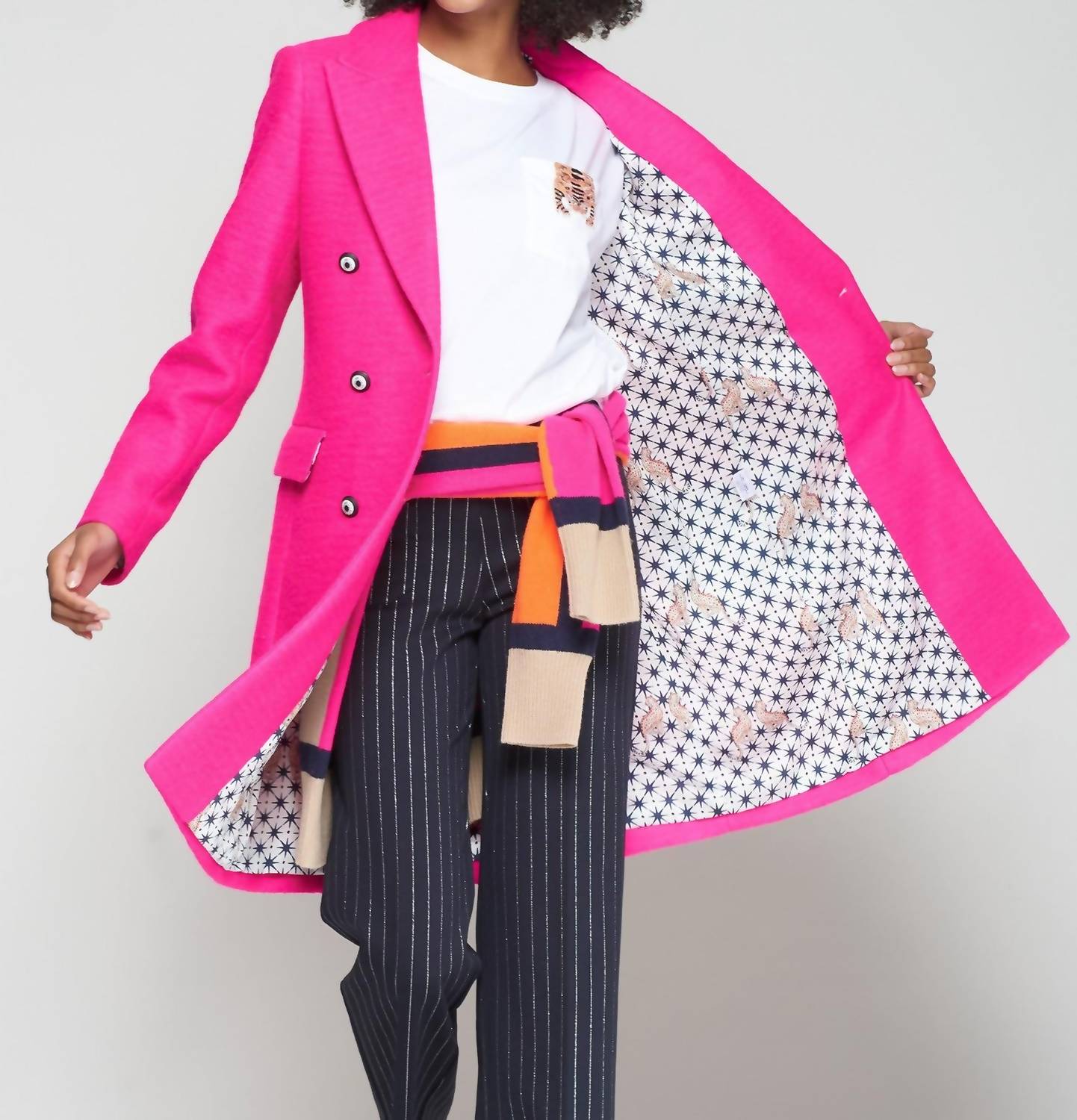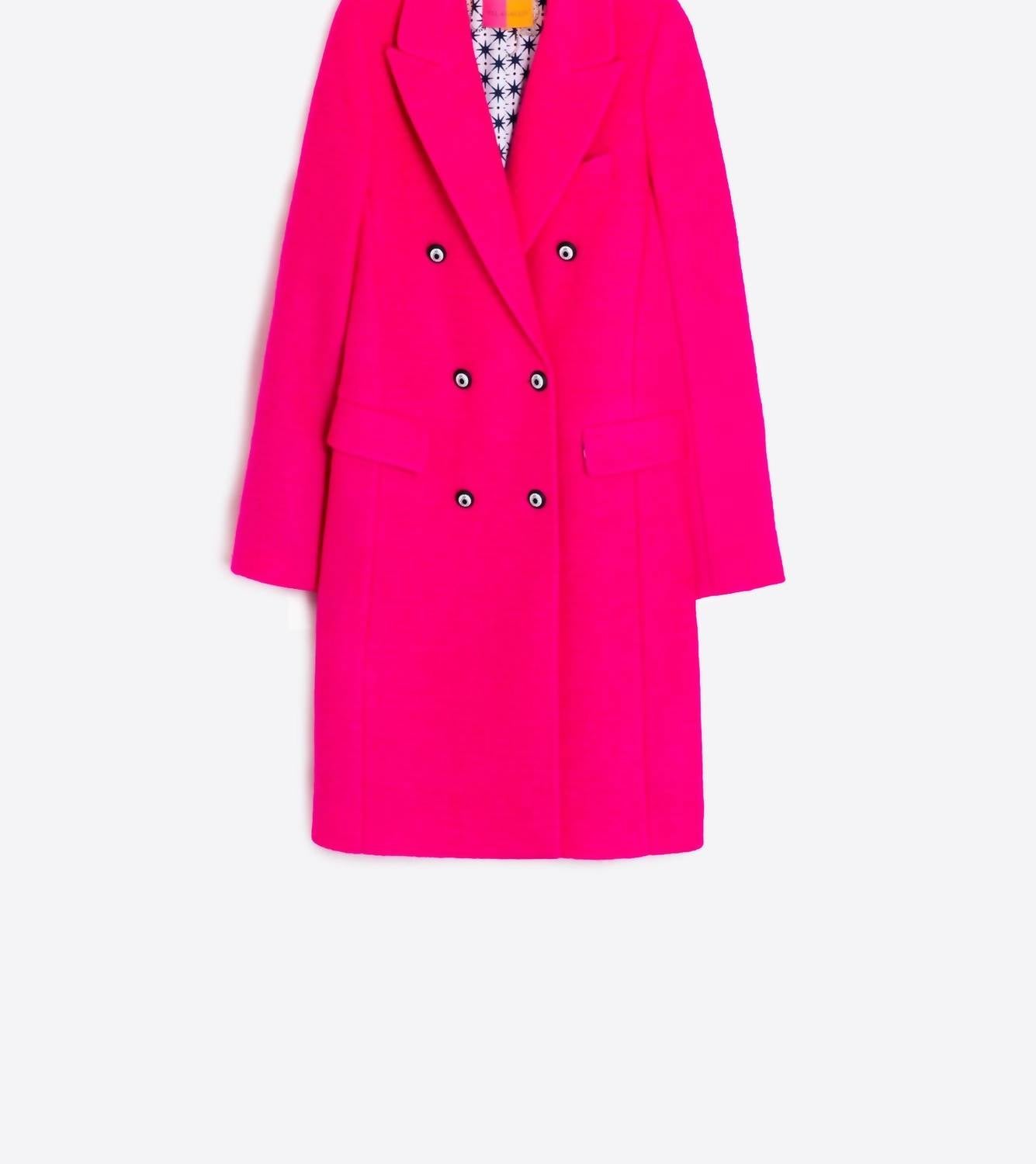 A timeless classic. You'll be reaching for this trench every season. Elevate your style with the Lian Long Coat by Vilagallo, a masterpiece in Rosa Fluor Lana designed for the modern woman. This long trench coat features a straight fit with long sleeves, crafted from a structured wool blend. The double-breasted button closure secures a classic lapel collar, revealing a contrasting orange inner. With its full printed lining and front flap pockets, care is simple with a dry clean only recommendation.