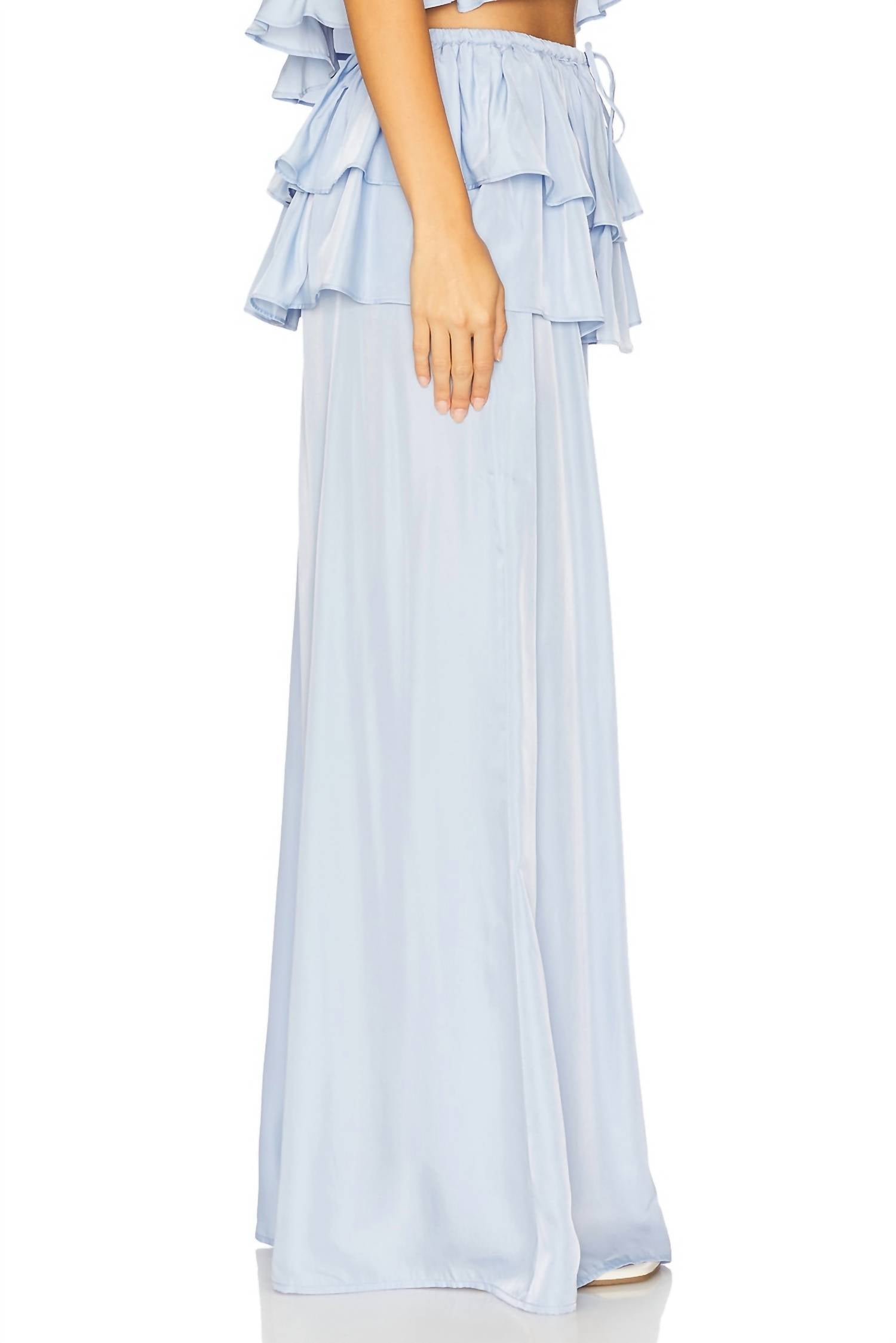 Discover the Ruffle Waist Flare Pant from WE WORE WHAT in a breezy Sky hue, perfect for your springtime celebrations. Crafted from a medium weight satin fabric with a composition of 66% rayon and 34% polyester, these trousers feature a relaxed, high-rise fit with a distinctive stepped waist design. The flared leg opens from 81 cm at the knee to 102 cm, complemented by an elastic waist with an adjustable drawstring for a personalized fit. Prioritize care with dry cleaning to maintain their pristine minimalist appeal.