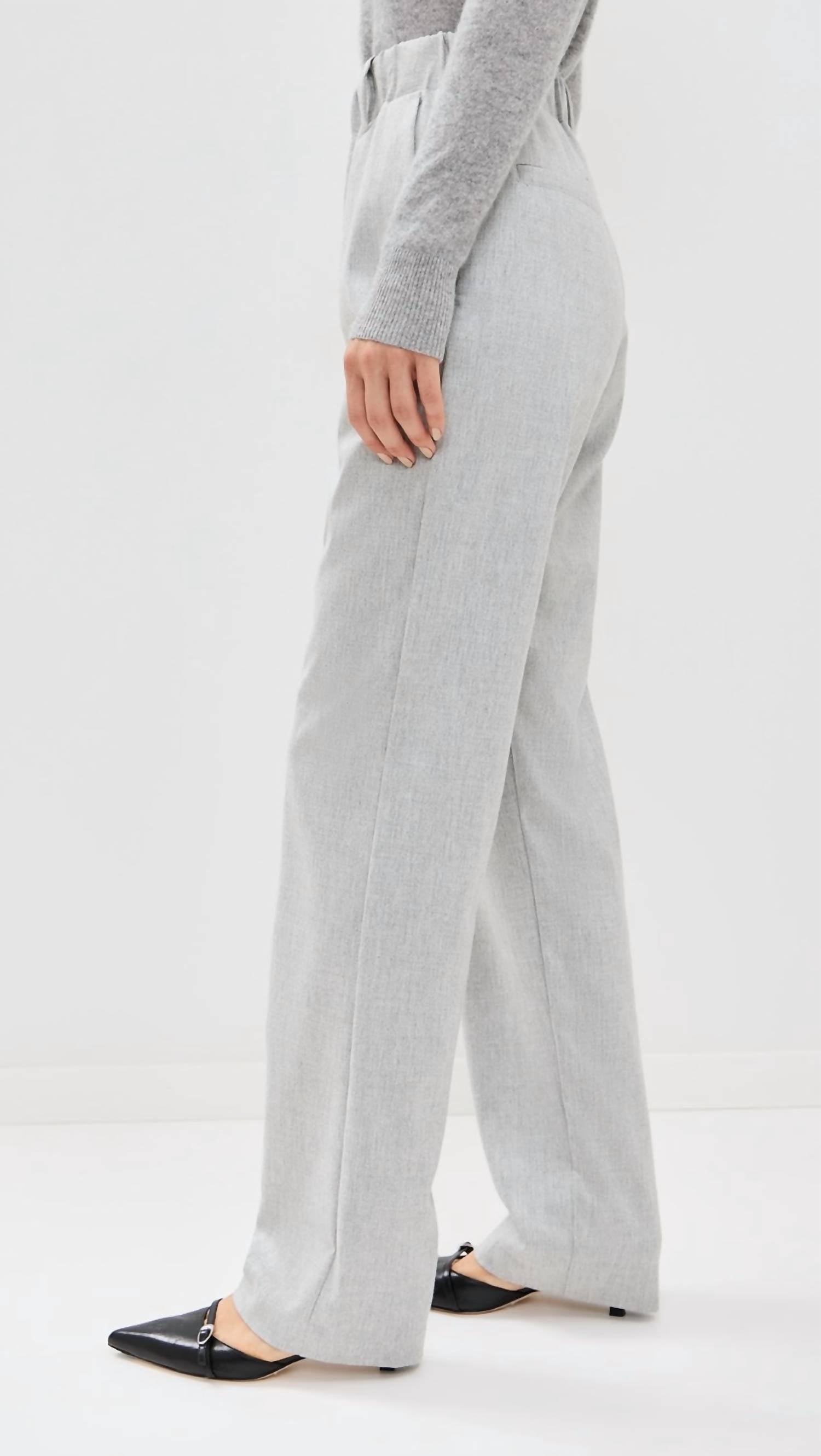 Discover the effortless sophistication of the Enza Costa Wool Suiting Pull-On Trouser in light grey, a must-have for any wardrobe. These women's trousers feature a relaxed fit with a high-rise elastic waistband, delivering comfort and style. Crafted in a wool blend with 17% wool, 54% viscose, 27% polyester, and 2% lycra, these pants come fully lined with 100% bemberg for a luxurious feel. The tapered leg narrows from 19" at the knee to 17" at the leg opening, complemented by four-pocket styling for practicality. Made in the USA, the trousers are designed for easy dry cleaning.