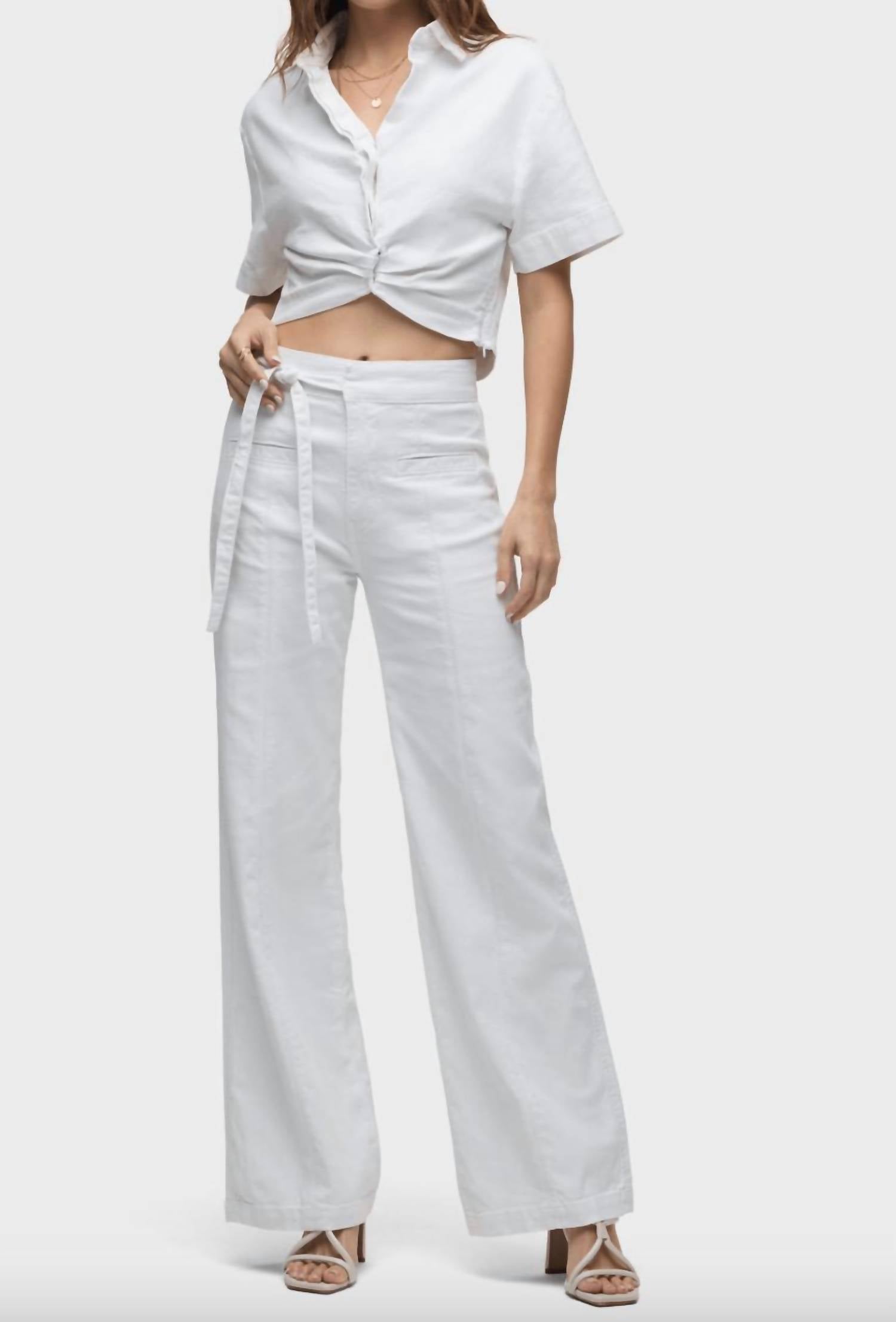 The Tie Waist Pin Tucked Trouser Pant by Hudson offers a sophisticated look in a crisp white, perfect for any occasion. Crafted from lyocell, these wide-leg, relaxed-fit trousers feature elegant pin-tuck detailing and a versatile tie waist for a personalized fit. Designed with practicality in mind, they come with pockets and a button closure for easy wear. Care instructions recommend machine washing and tumble drying to keep them looking fresh.