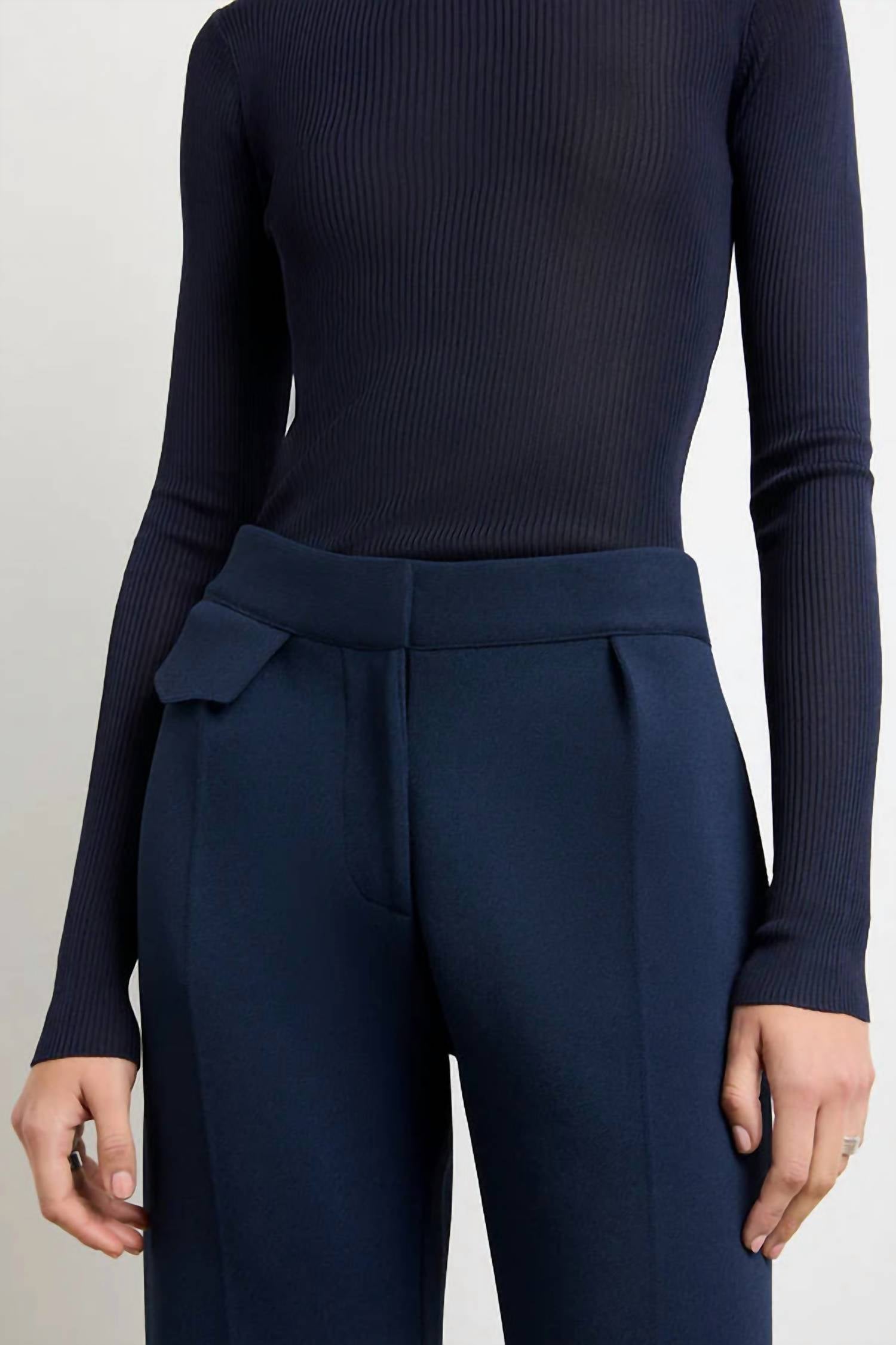 Experience the epitome of comfort and style with the Cecily Tailored Knit Trousers by Brandon Maxwell, crafted in a sumptuous viscose poly blend knit. These navy trousers feature a straight leg design, comfort fit, and are designed to sit high on the waist for a polished silhouette. Originating from Italy, they include a practical center front zip and hook closure for ease of wear. Care instructions specify dry clean only to maintain their luxurious quality. Model is 5'11" and wears a size XS.