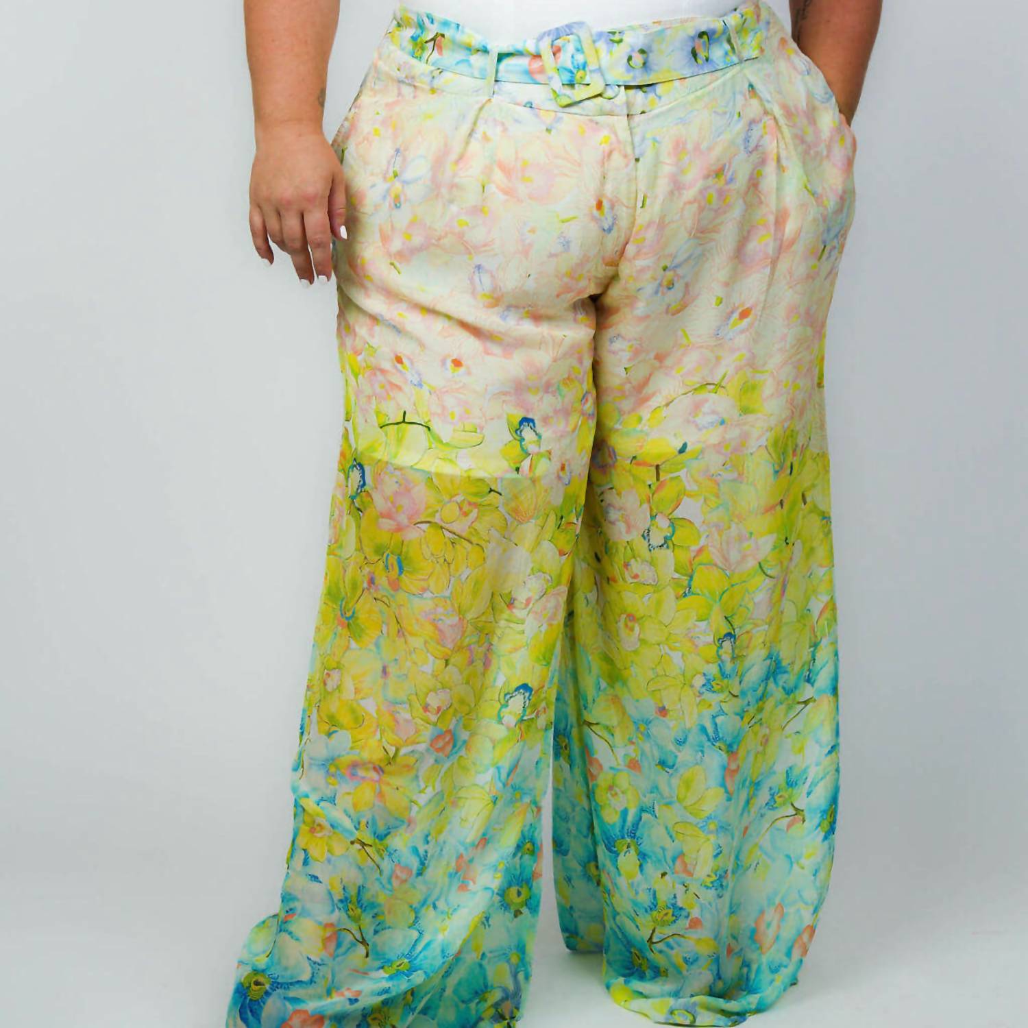 Elevate your vacation style with the Florida Floral Ombre Pants by La Fuori, a celebration of wild gardens and boho chic. These multi-colored trousers showcase a floral pattern with a button closure, while the relaxed fit and flared leg offer comfort and flow. Designed with a high-rise waist and featuring handy pockets, they effortlessly elongate your lower body. The addition of a tie front belt in silk chiffon adds a sophisticated finish, making them perfect for spring getaways.